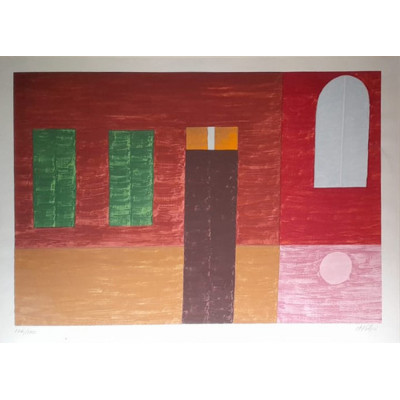 Alfredo Volpi - Composição com Arcos - Gravura do Espólio de Alfredo Volpi, assinada e numerada 3/200;carimbo e chancela do espólio no verso. Reproduzida no catálogo James Lisboa out.2022. Pgs. 81 e 82 L.157 item 5. - 51 x 75 cm.