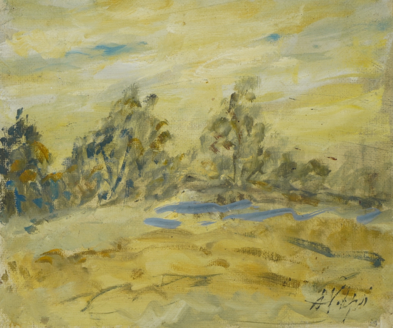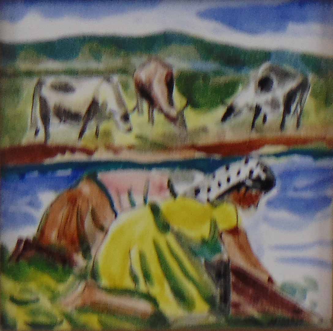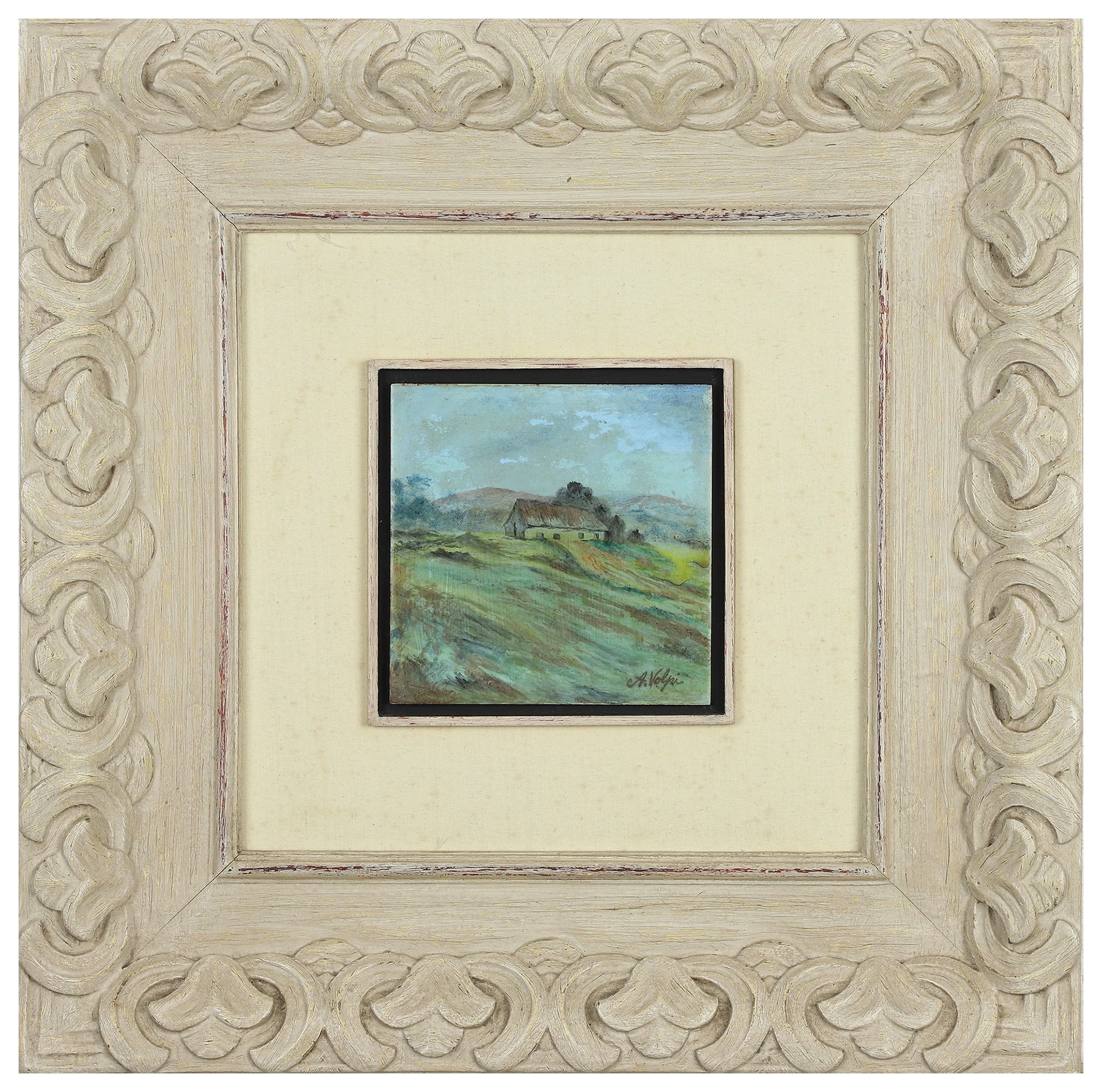 Alfredo Volpi - Estudo para Paisagem com vacas - Óleo sobre eucatex - Assinado canto inferior direito - 28 x 33 cm.