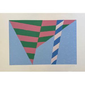 Alfredo Volpi - Vela e bandeirinhas. Matriz de gravura em cobre, 47x72 cm, déc 80.