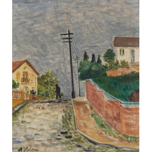 Alfredo Volpi - Rua com figura - 1928 - Óleo sobre tela - Assinado canto inferior esquerdo - 64 x 54 cm. Registrada na 1° catalogação geral do artista (raisonné) feita pelo Instituto Alfredo Volpi sob o tombo 0704, reproduzida no Catálogos de Obras Alfredo Volpi 2015, edição comemorativa do centenário da 1a pintura, pág. 65. Participou da exposição "Volpi 89 anos”, curadoria de Jacob Klintowitz, Dan Galeria, São Paulo, 1985. Etiqueta Dan Galeria e Renato Withacker no verso.