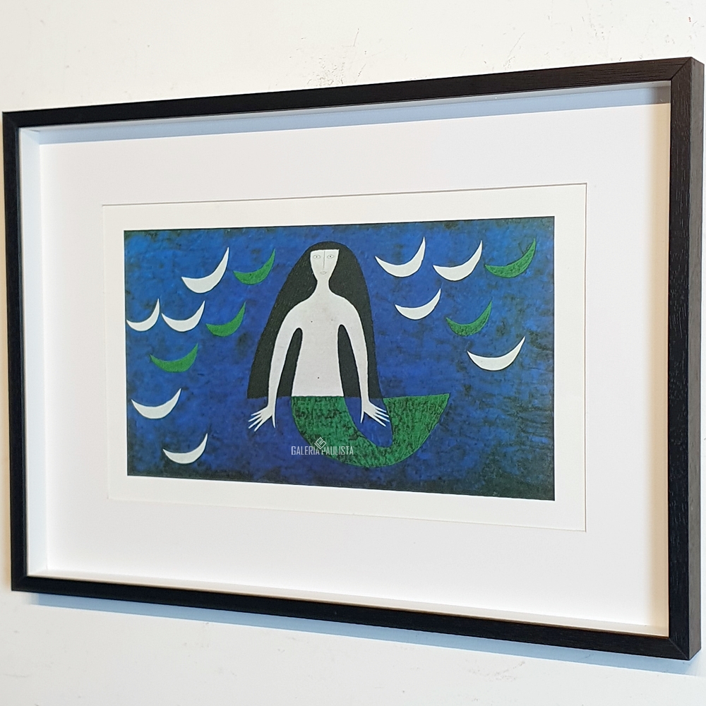ALFREDO VOLPI "Sereia" Serigrafia Offset Colorida S/ Papel. Med: 38x51 cm (Obra-ME) 41x58 cm (Mold). Obra/Prancha nº 12 extraída do Álbum "Grandes Pintores Brasileiros" por Petite Galerie, editada pela Editora Fontana e Livraria Cultura em Nov/1975. Com nova moldura em madeira "tipo caixa", com passpartout, vidro de proteção, e foamboard anti-mofo no verso. Sem Assinatura. Estado de conservação: Ótimo. Medida da Imagem 21x38 cm (M.I.).