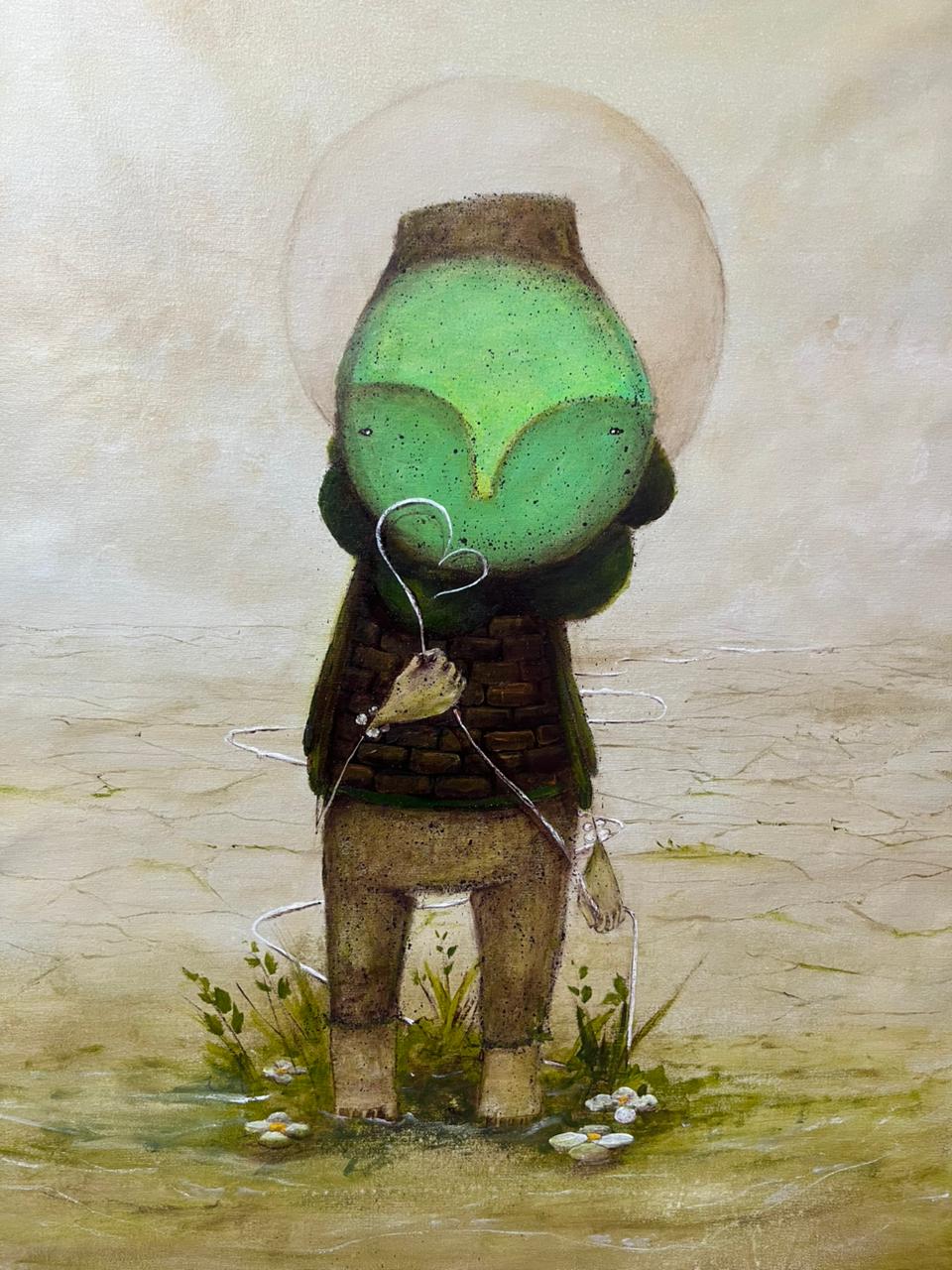 Em uma vasta solidão eu me encontrei retrata o paradoxo de estar só e, ainda assim, inteiro. A figura mergulha num silêncio árido, um solo seco que pesa no peito. Mas é justamente nesse vazio que começa o retorno: a natureza ao redor brota como resposta, envolvendo o personagem e oferecendo cura. Folha por folha, a vida se reconstrói. A obra não romantiza a dor — ela mostra que, às vezes, é preciso atravessar o deserto particular para se reencontrar em si mesma.