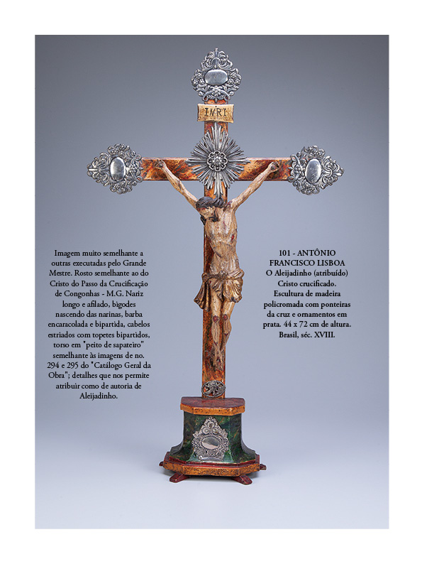 • - 1796-99. Executou em Congonhas do Campo, com o auxílio de artistas colaboradores de sua oficina, as 64 figuras em madeira (cedro) que compõem a Via Sacra. Distribuiu as imagens em sete grupos, representando, sucessivamente, os episódios da Ceia dos Apóstolos, da Agonia no Jardim das Oliveiras, da Prisão, da Flagelação, da Coroação de espinhos, do Caminho do Calvário e da Crucificação. Concebeu cada um desses conjuntos escultóricos como uma autêntica cena teatral, seguindo a tradição européia das representações dos “Mistérios” medievais e, em todos os grupos, concedeu o principal destaque às esculturas do Cristo, nas quais representou nuances variadas do sofrimento humano em expressões de extrema sensibilidade. Sua genialidade como escultor encontrou campo privilegiado de expressão neste monumental conjunto do santuário de Congonhas, todo ele reunido em um único sítio.