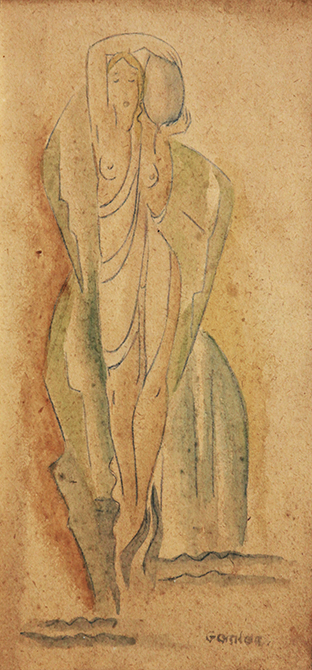Antonio Gomide - Cena idílica com casal - déc. 1920 - Aquarela sobre papel - Assinado canto inferior direito - 30 x 15 cm.