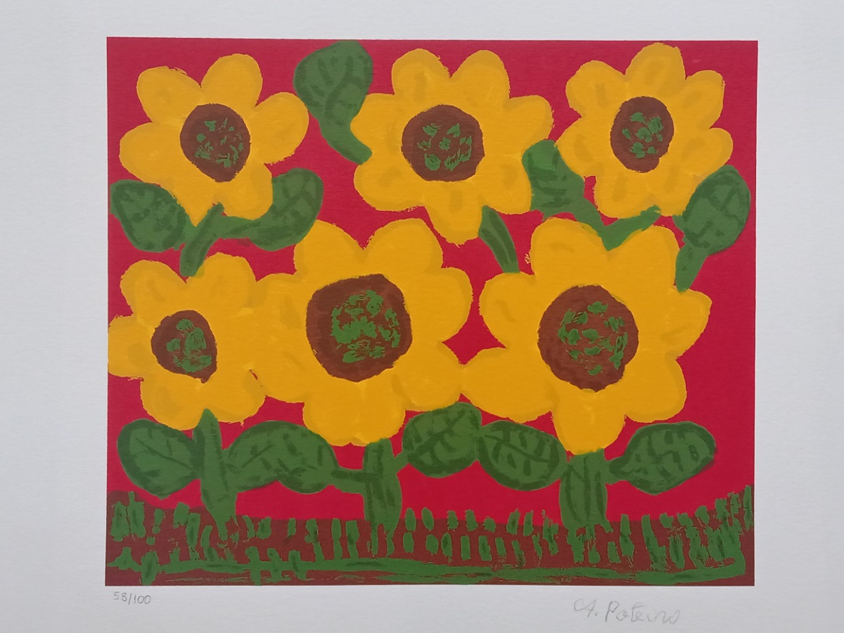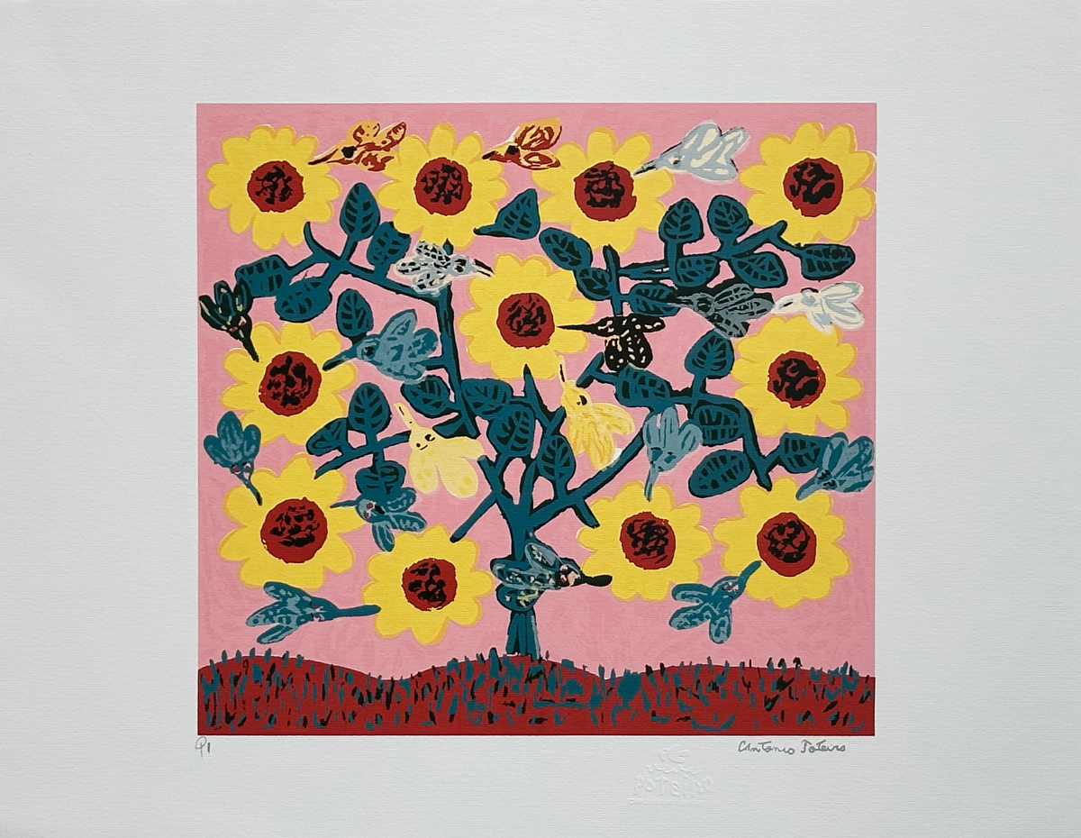 Flores com girassóis – 85 x 85 cm – Gravura sem Moldura – Ass. Canto Inferior Direito – Exemplar 82/190 - Apresenta pequenos amassados nas bordas