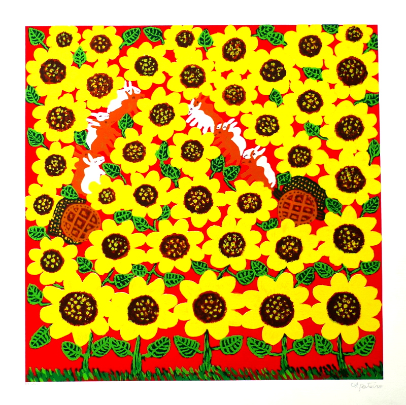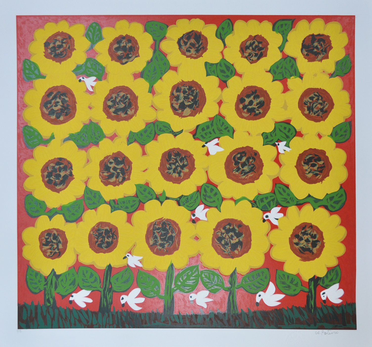 ANTONIO POTEIRO, Girassóis fundo laranja - serigrafia - 36x48 cm - Póstuma - 90/100
