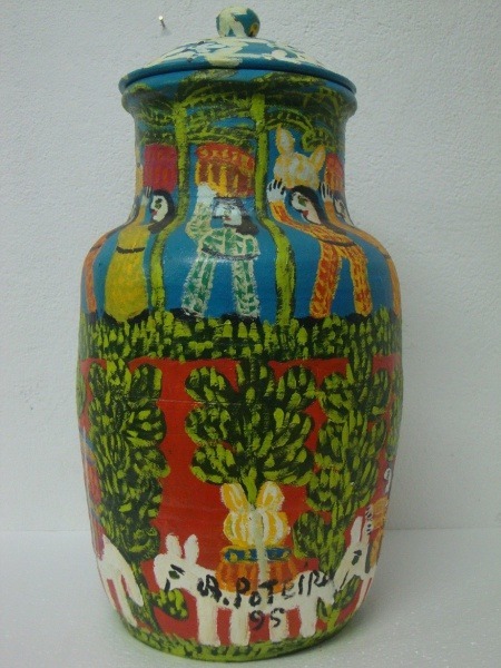 ANTONIO POTEIRO (1925–2010) – Escultura em cerâmica. Pintor e ceramista português radicado no Brasil, considerado um dos principais nomes da arte naïf brasileira, com produção marcada por cenas populares, profusão de personagens e forte caráter narrativo, amplamente presente em coleções públicas e privadas. Dimensões: alt. 46 cm.