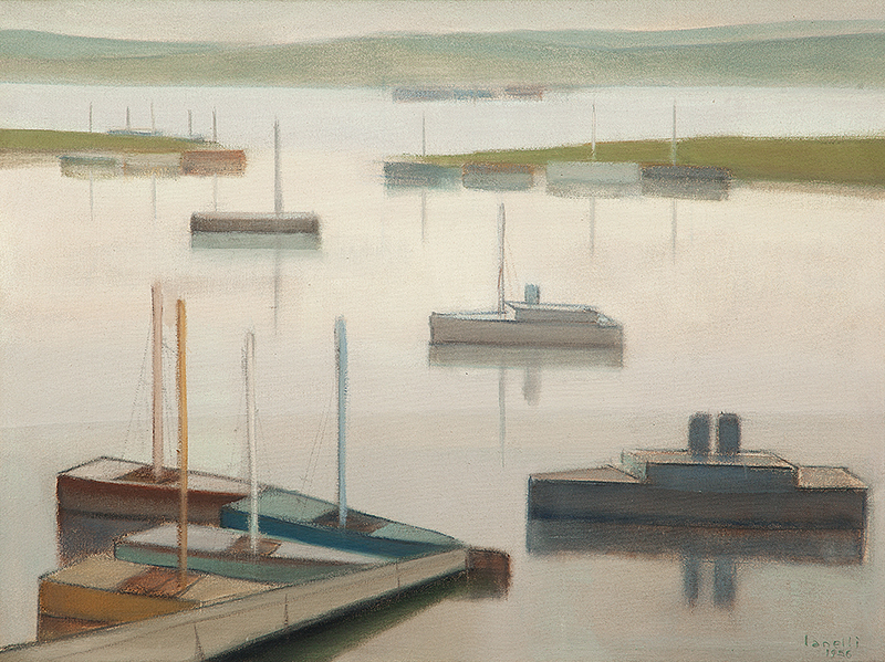 Arcangelo Ianelli (São Paulo SP 1922 - idem 2009). Pintor, escultor, ilustrador e desenhista. Inicia-se no desenho como autodidata. Em 1940, estuda perspectiva na Associação Paulista de Belas Artes e, em 1942, recebe orientação em pintura de Colette Pujol. Dois anos depois, freqüenta o ateliê de Waldemar da Costa com Lothar Charoux, Hermelindo Fiaminghi e Maria Leontina. Durante a década de 1950 integra o Grupo Guanabara juntamente com Manabu Mabe,Yoshiya Takaoka, Jorge Mori, Tomoo Handa, Tikashi Fukushima e Wega Nery, entre outros. A partir da década de 1940, produz cenas cotidianas, paisagens urbanas e marinhas, que revelam grande síntese formal e uma gama cromática em tons rebaixados. Por volta dos anos 1960, volta-se ao abstracionismo informal e produz telas que apresentam densidade matérica e cores escuras. No fim dos anos 1960, sua obra é ao mesmo tempo linear e pictórica, onde se destaca o uso de grafismos. Já a partir de 1970, volta-se à abstração geométrica e emprega principalmente retângulos e quadrados, que se apresentam como planos superpostos e interpenetrados. Atua ainda como escultor, desde a metade da década de 1970, quando realiza obras em mármore e em madeira, nas quais retoma questões constantes na obra pictórica. Em 2002, comemora os seus 80 anos com retrospectiva montada pela Pinacoteca do Estado de São Paulo - Pesp.