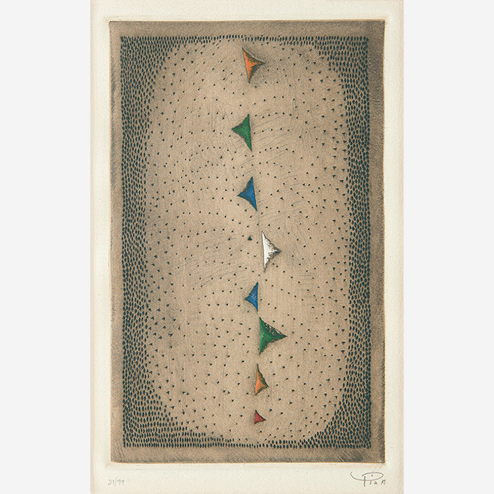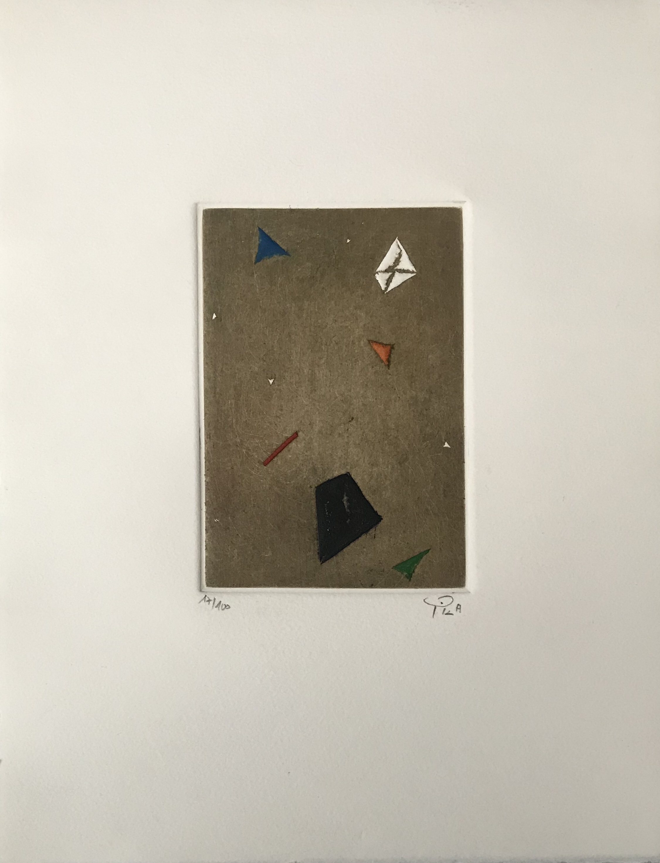 Arthur Luiz Piza (São Paulo SP 1928). Gravador, desenhista e escultor. Inicia a formação artística em 1943, estudando pintura e afresco com Antonio Gomide (1895 - 1967). Após participar da 1ª Bienal Internacional de São Paulo, em 1951, viaja para a Europa e passa a residir em Paris. Freqüenta o ateliê de Johnny Friedlaender (1912 - 1992) e aperfeiçoa-se nas técnicas de gravura em metal, água-forte, talho-doce, água-tinta e ponta-seca. Em 1953, participa da 2ª Bienal Internacional de São Paulo e obtém o prêmio aquisição. Na 5ª Bienal, em 1959, é contemplado com o grande prêmio nacional de gravura. Nesse período, começa a fazer relevos, picotando suas aquarelas e aproveitando os fragmentos em colagens sobre tela, papel, cobre e madeira. Posteriormente cria relevos de metal sobre sisal, e produz peças tridimensionais em grande escala e trabalhos em porcelana e ourivesaria. Realiza ilustrações para diversos livros, de tiragens reduzidas. No fim dos anos 1980, cria um mural tridimensional para o Centro Cultural da França, em Damasco, Síria. Em 2002, são apresentadas na Pinacoteca do Estado de São Paulo - Pesp, e no Museu de Arte do Rio Grande do Sul Ado Malagoli - Margs, em Porto Alegre, duas amplas retrospectivas de sua obra.