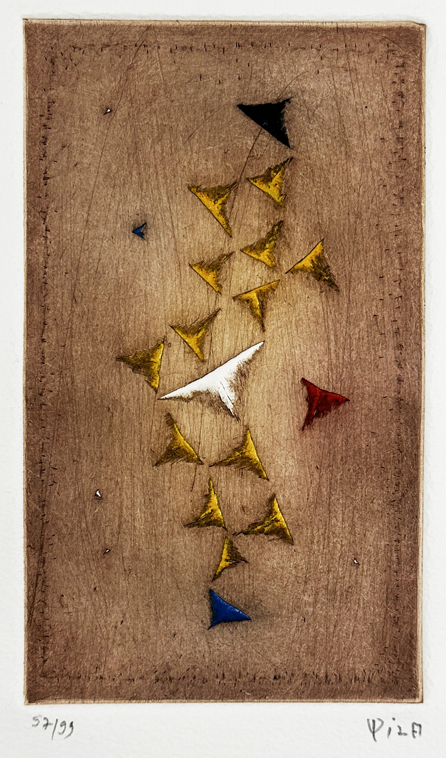 Arthur Luiz Piza (São Paulo SP 1928). Gravador, desenhista e escultor. Inicia a formação artística em 1943, estudando pintura e afresco com Antonio Gomide (1895 - 1967). Após participar da 1ª Bienal Internacional de São Paulo, em 1951, viaja para a Europa e passa a residir em Paris. Freqüenta o ateliê de Johnny Friedlaender (1912 - 1992) e aperfeiçoa-se nas técnicas de gravura em metal, água-forte, talho-doce, água-tinta e ponta-seca. Em 1953, participa da 2ª Bienal Internacional de São Paulo e obtém o prêmio aquisição. Na 5ª Bienal, em 1959, é contemplado com o grande prêmio nacional de gravura. Nesse período, começa a fazer relevos, picotando suas aquarelas e aproveitando os fragmentos em colagens sobre tela, papel, cobre e madeira. Posteriormente cria relevos de metal sobre sisal, e produz peças tridimensionais em grande escala e trabalhos em porcelana e ourivesaria. Realiza ilustrações para diversos livros, de tiragens reduzidas. No fim dos anos 1980, cria um mural tridimensional para o Centro Cultural da França, em Damasco, Síria. Em 2002, são apresentadas na Pinacoteca do Estado de São Paulo - Pesp, e no Museu de Arte do Rio Grande do Sul Ado Malagoli - Margs, em Porto Alegre, duas amplas retrospectivas de sua obra.