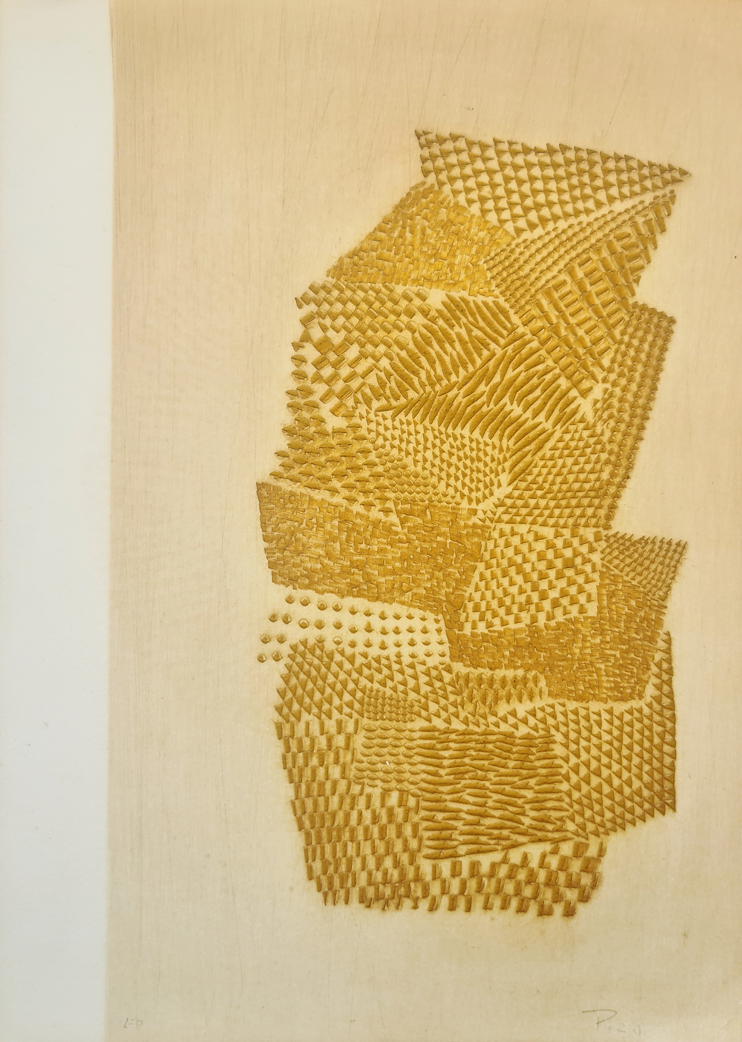 Arthur Luiz Piza (São Paulo SP 1928). Gravador, desenhista e escultor. Inicia a formação artística em 1943, estudando pintura e afresco com Antonio Gomide (1895 - 1967). Após participar da 1ª Bienal Internacional de São Paulo, em 1951, viaja para a Europa e passa a residir em Paris. Freqüenta o ateliê de Johnny Friedlaender (1912 - 1992) e aperfeiçoa-se nas técnicas de gravura em metal, água-forte, talho-doce, água-tinta e ponta-seca. Em 1953, participa da 2ª Bienal Internacional de São Paulo e obtém o prêmio aquisição. Na 5ª Bienal, em 1959, é contemplado com o grande prêmio nacional de gravura. Nesse período, começa a fazer relevos, picotando suas aquarelas e aproveitando os fragmentos em colagens sobre tela, papel, cobre e madeira. Posteriormente cria relevos de metal sobre sisal, e produz peças tridimensionais em grande escala e trabalhos em porcelana e ourivesaria. Realiza ilustrações para diversos livros, de tiragens reduzidas. No fim dos anos 1980, cria um mural tridimensional para o Centro Cultural da França, em Damasco, Síria. Em 2002, são apresentadas na Pinacoteca do Estado de São Paulo - Pesp, e no Museu de Arte do Rio Grande do Sul Ado Malagoli - Margs, em Porto Alegre, duas amplas retrospectivas de sua obra.