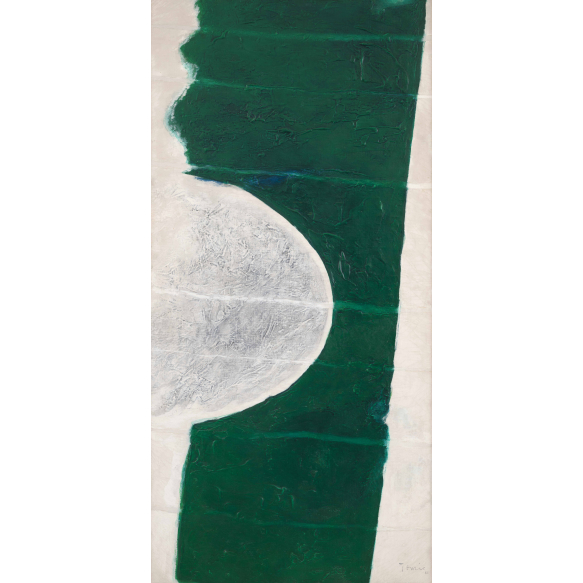 Se Cavalcanti e Portinari falam do Brasil com narrativas simbólicas, Tomie Ohtake responde com o silêncio da forma. Sua tela Sem título (1968) condensa em poucos gestos uma presença monumental: um campo verde profundo é cortado por um semicírculo branco em textura sutil, evocando ausência, tensão e serenidade.