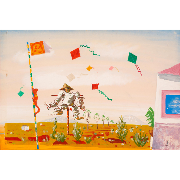 Ao lado, Espantalho (1944), de Portinari, introduz um contraponto de ironia. Feito em guache sobre papel, o espantalho carnavalesco brinca com a imagem da roça e da festa, mas também sugere abandono e melancolia. A figura é híbrida: ao mesmo tempo defensiva e decorativa, popular e crítica.