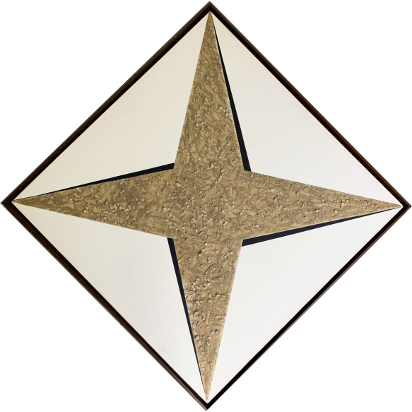 Na mesma chave, a estrela branca de Hércules Barsotti impõe uma presença escultural sobre a tela. Feita com areia e pedra, a forma rígida torna-se matéria pulsante. A geometria deixa de ser apenas um código visual para ganhar densidade física e sensorial.