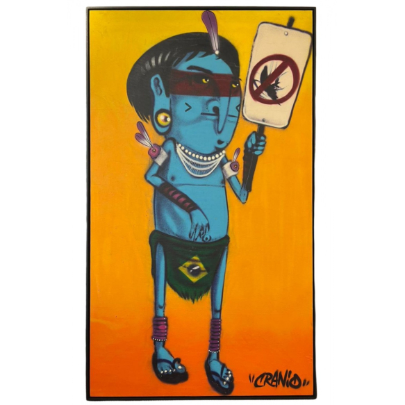 Fechando o ciclo, Cranio — com seu indígena azul em protesto contra o desmatamento — reaparece como personagem contemporâneo da resistência. O spray sobre tela, técnica urbana e efêmera, transforma-se em porta-voz da crise ambiental, em performance visual com humor, denúncia e identidade.