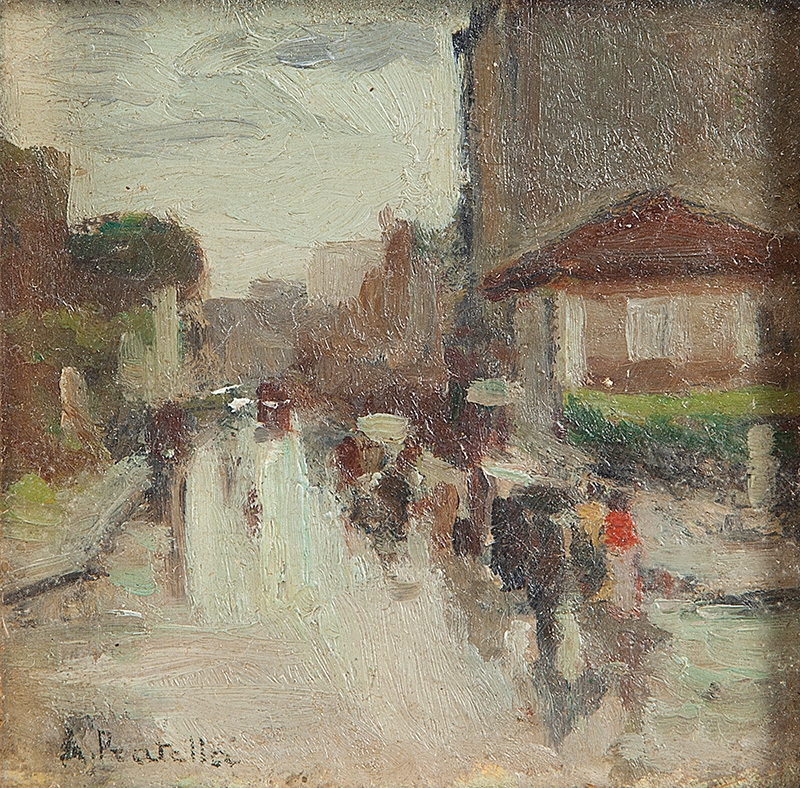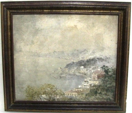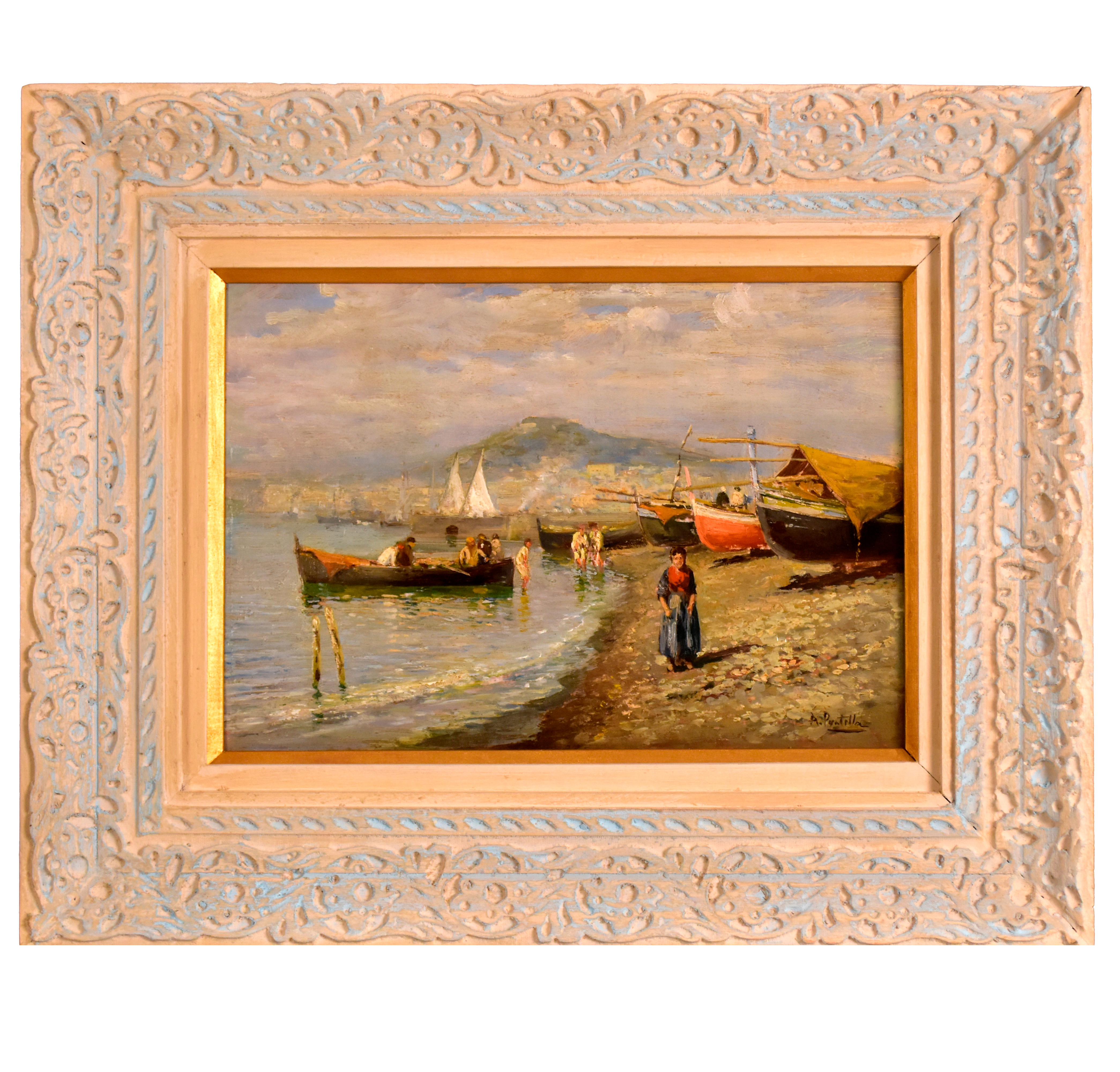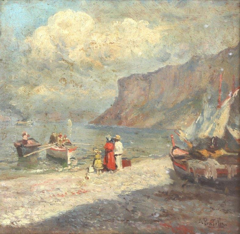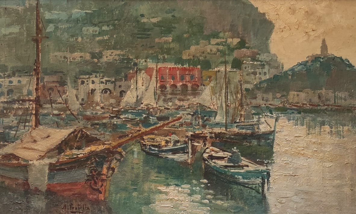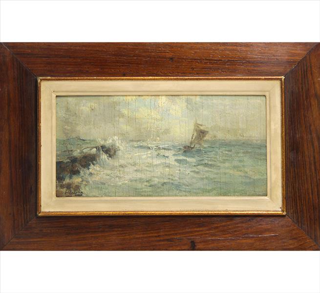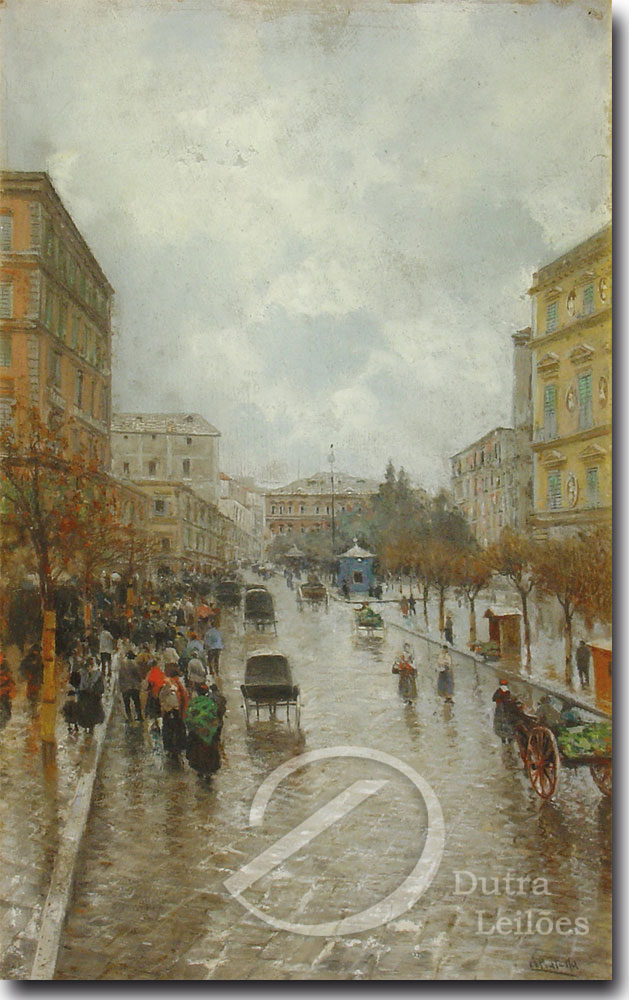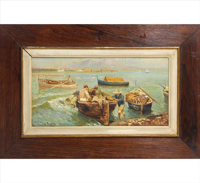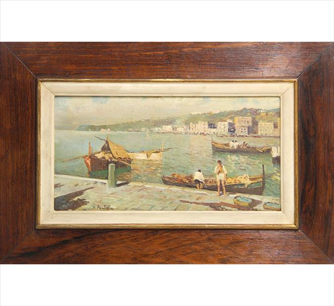 ATTILIO PRATELLA - (1856-1949) Marinha - OSM - Cid - 22 x 23 cm. Attilio Pratella (1856-1949) foi um pintor italiano especializado em paisagens e cenas urbanas de Nápoles. Nascido em Lugo di Romagna, formou-se na Accademia di Belle Arti de Bolonha e depois em Nápoles, onde estudou com mestres como Domenico Morelli. Radicado em Nápoles, dedicou-se a representar com grande sensibilidade o cotidiano da cidade, seus mercados, portos, bairros populares, além de vistas da ilha de Capri e da costa de Sorrento. Seu estilo combina elementos do naturalismo e do impressionismo, com pinceladas rápidas, tonalidades suaves e uma atenção refinada à luz e à atmosfera. Ele foi um dos principais nomes da escola napolitana de pintura no final do século XIX e início do XX. Participou de importantes exposições nacionais e internacionais, como a Bienal de Veneza o Salon de Paris, recebendo prêmios e reconhecimento. Obras como Di Mattina e Impressione di vento ilustram sua maestria em captar e cenas simples com profundidade estética e emocional. Pratella influenciou uma geração de artistas, inclusive seus filhos, que também seguiram carreira artística. Seu legado permanece presente em coleções públicas e privadas, sendo considerado um dos grandes cronistas visuais da Nápoles de seu tempo.