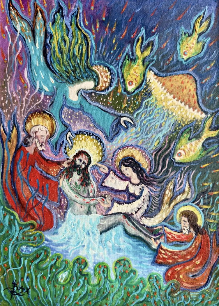 Bax - Santo Antônio com Menino Jesus - Acrílica Sobre Tela - 50 x 40 - Ass. Canto Infer Esquerdo
