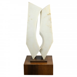 Bruno Giorgi. Brasil, século XX. Sem Título. Escultura de mármore branco, provavelmente estatuário, apoiada sobre base quadrada de madeira nobre de 32 cm de lados e 12 cm de altura; 79 cm de altura total. Assinatura incizada em ambas as extremidades: B Giorgi.
