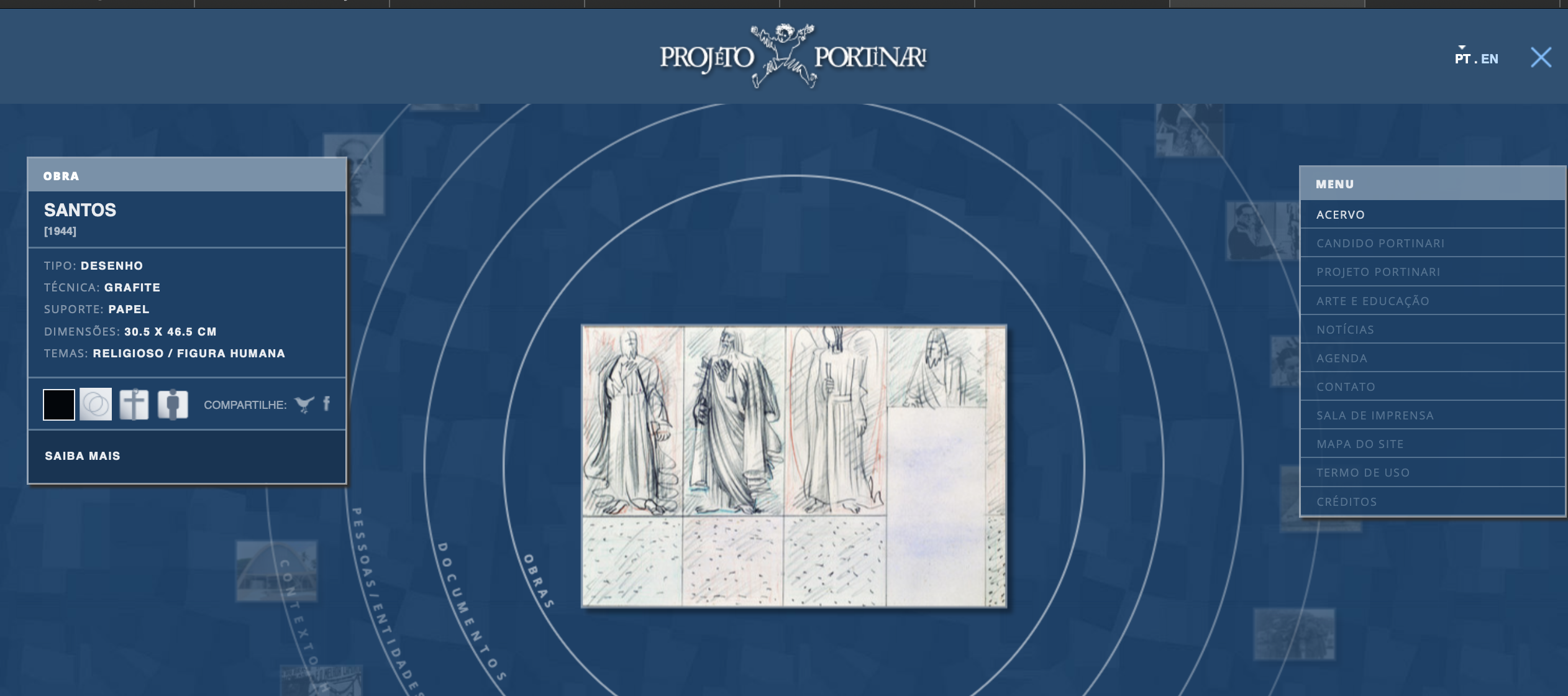 1937-1945: Vivíamos um período que insistentemente Gustavo Capanema – Ministro da Educação e Saúde Pública – queria dar visibilidade às propostas “modernas” que circulavam nos ambientes intelectuais da capital federal durante o Estado Novo, materializada através da construção de um “moderno” edifício para o MEC – Lúcio Costa, Oscar Niemeyer, et allis – e importante na vida de Portinari que compôs afrescos mostrando nosso “Ciclo Econômico” além dos cartões para os azulejos que revestem as paredes externas do edifício, que foram fabricados pela Osirarte, em São Paulo (1943, ca.). Em 1944, um acontecimento maior com a realização mural e azulejos sobre a vida de São Francisco para a Capela do Complexo da Pampulha em Belo Horizonte – leia-se Oscar Niemeyer – que completaria com a “Via Sacra” em 1945[6].