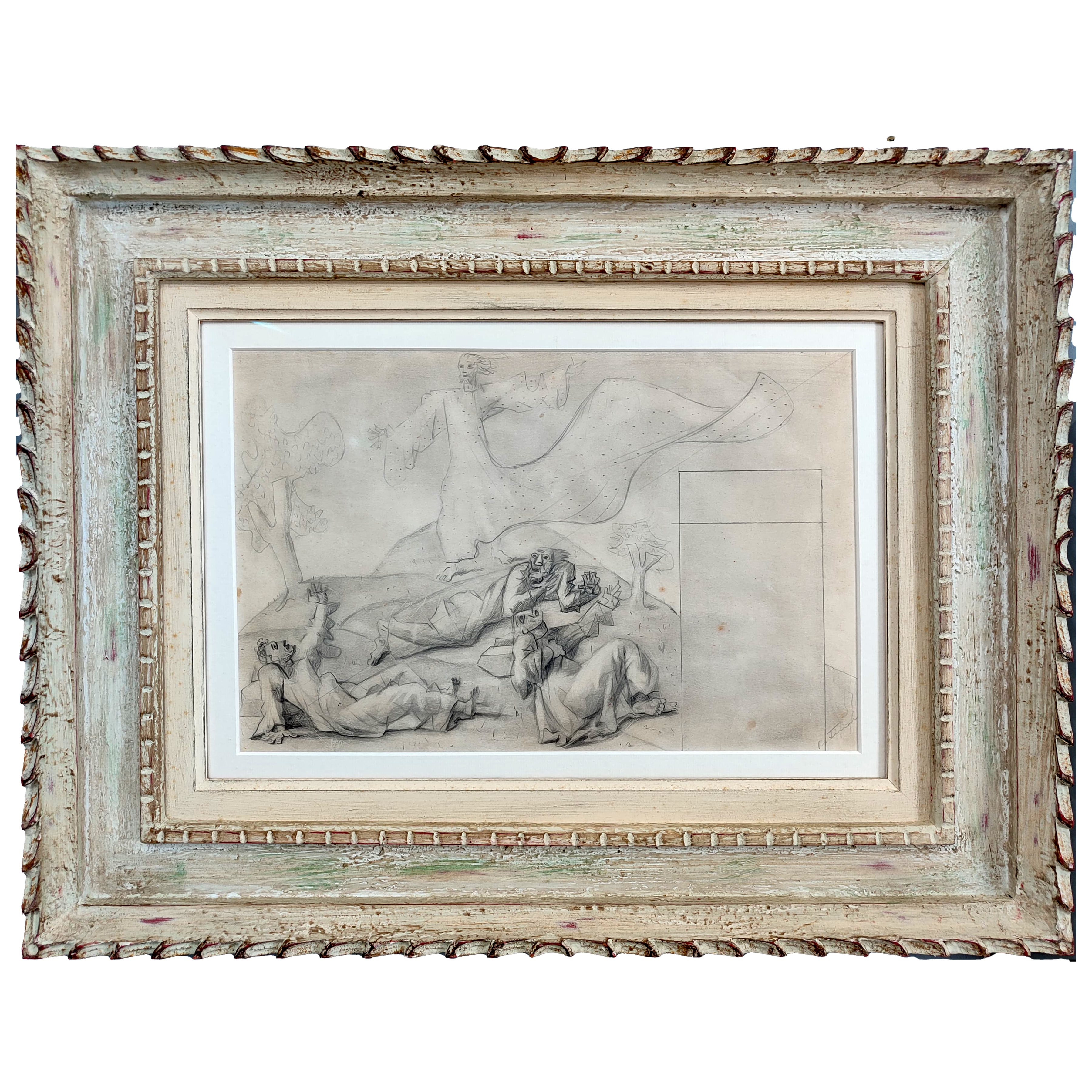 PORTINARI - Candido (Brodowski, SP 1903 — Rio de Janeiro, 1962) 28x17,5 cm./ 56x45,5 cm. Desenho a grafite. "O batismo de Jesus", 1944 Reproduzido no catálogo raisonné do Projeto Portinari. 2169 FCO1021, volume 3, página 45 “Divina Pastora” [FCO 1013] TEMAS: Religioso:Cenas Religiosas:Batismo de Jesus Religioso:Jesus Religioso:Santos:São João Batista Figura Humana:Grupo:Homens Figura Humana:Figura DESCRIÇÃO: Composição em preto e branco. Linhas de contorno e áreas de sombras. São João batizando Jesus e três pessoas observando a cena. À direita do suporte espaço em forma de retângulo, em branco, correspondente à porta da parede da sala de jantar onde seria realizada a pintura mural. As figuras estão esquematizadas. Ao centro, figura em pé, de frente, com braços abertos. A seu lado esquerdo, São João em pé, de perfil para a esquerda, segura na mão esquerda uma cumbuca que está acima da cabeça de Jesus. Um pouco mais ao fundo, à esquerda, grupo de três figuras em pé, olhando na direção de Jesus e de São João. O fundo e o chão são geometrizados em áreas irregulares esquemáticas claras e escuras, sugerindo morros.