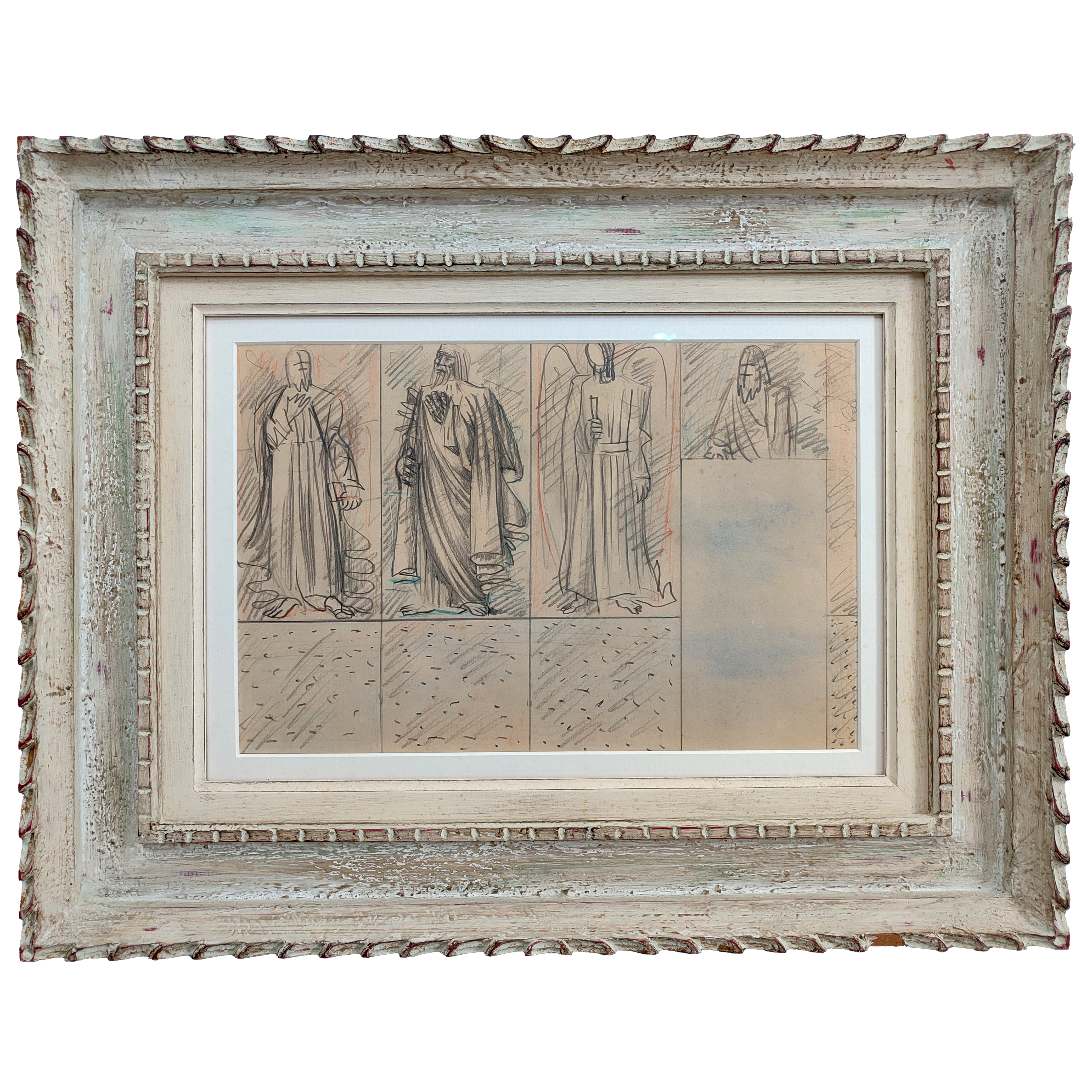 PORTINARI - Candido CLICK AQUI E ASSISTA O VIDEO (Brodowski, SP 1903 — Rio de Janeiro, 1962) 42,5x58,5 cm. / 70,5 x86,5 cm. Desenho a grafite lápis de cor. Reproduzido no catálogo raisonné do Projeto Portinari "Santos", 1944. 2175 FCO1020, volume 3, página 46. Divina Pastora” [FCO 1013] TEMAS: Religioso:Santos Religioso:Arcanjo Figura Humana:Homem DESCRIÇÃO: Composição nos tons preto, rosa, azul e branco. Linhas de contorno e sombreados. Suporte dividido em três retângulos dispostos lado a lado, na vertical, arrematados por quadrados na parte de baixo. À direita, retângulo maior, em azul, que corresponde ao espaço da porta da parede da sala de jantar, onde seria realizada a pintura mural; acima deste retângulo outro menor servindo de arremate. No primeiro retângulo, santo em pé de frente usando longa túnica e manto, braço dobrado na altura do peito e o esquerdo ao longo do corpo, rosto esboçado com barba; fundo em tom rosa. No segundo retângulo outro santo em pé, 3/4 voltado para a esquerda, usando longa túnica e manto, braço esquerdo dobrado na altura do peito, rosto esboçado com longa barba; fundo em tom de azul. No terceiro retângulo, arcanjo em pé, de frente; tem grandes asas, veste túnica longa e segura na mão direita espécie de espada cuja ponta está apoiada no chão; fundo em tom azul. No retângulo acima da porta, meio-busto de santo com barba contra fundo rosa. O fundo de todos os retângulos além da cor estão preenchidos por tracejado rápido de grafite, os dois quadrados laterais abaixo dos retângulos estão coloridos de azul, vendo-se também tracejado rápido a grafite e pontinhos. O quadrado central está colorido de rosa também com rápido tracejado a grafite e pontinhos.