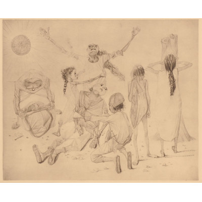 Portinari, Cândido. Sertão. Reprodução fotomecânica, 29,5 cm x 39,5 cm. Assinado e datado embaixo ao centro: Portinari 954. Origem: espólio de Cárbia Sabatel Bourroul e José Celestino Monteiro de Barros Bourroul.