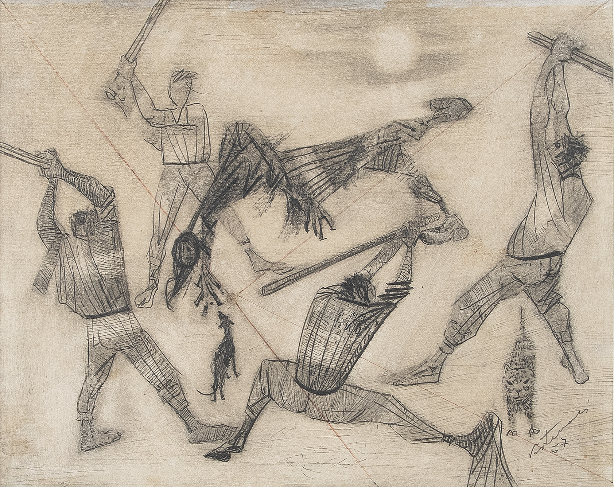 CANDIDO PORTINARI "Derrubada" RotoGravura S/ Papel Westerpost, Emoldurada -Med: 36x54 cm (Obra-ME) -Assinado e Dat impresso no CID na "chapa" -Obra/Prancha extraída Álbum/Exemplar nº 829 "Mestres do Desenho" por Carlos Drumond de Andrade, editado pela Cutrix -Data: Déc 60 -Com nova moldura, vidro de proteção e foamboard anti-mofo no verso. Estado de conservação: Ótimo.
