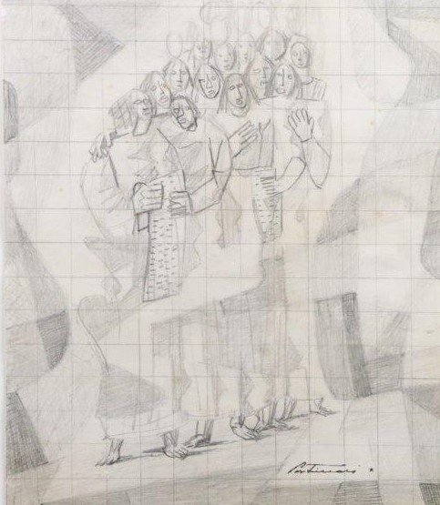 PORTINARI - Candido (Brodowski, SP 1903 — Rio de Janeiro, 1962) 28x17,5 cm./ 56x45,5 cm. Desenho a grafite. "O batismo de Jesus", 1944 Reproduzido no catálogo raisonné do Projeto Portinari. 2169 FCO1021, volume 3, página 45 “Divina Pastora” [FCO 1013] TEMAS: Religioso:Cenas Religiosas:Batismo de Jesus Religioso:Jesus Religioso:Santos:São João Batista Figura Humana:Grupo:Homens Figura Humana:Figura DESCRIÇÃO: Composição em preto e branco. Linhas de contorno e áreas de sombras. São João batizando Jesus e três pessoas observando a cena. À direita do suporte espaço em forma de retângulo, em branco, correspondente à porta da parede da sala de jantar onde seria realizada a pintura mural. As figuras estão esquematizadas. Ao centro, figura em pé, de frente, com braços abertos. A seu lado esquerdo, São João em pé, de perfil para a esquerda, segura na mão esquerda uma cumbuca que está acima da cabeça de Jesus. Um pouco mais ao fundo, à esquerda, grupo de três figuras em pé, olhando na direção de Jesus e de São João. O fundo e o chão são geometrizados em áreas irregulares esquemáticas claras e escuras, sugerindo morros.