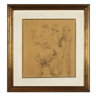 Candido Portinari - Anjo com trombeta - 1944 - Sanguínea e grafite sobre papel montado em tela - Assinado canto inferior direito - 94 x 136 cm. Registrado e certificado pelo Projeto Portinari. Reproduzido no Catálogo Raisonné so artista, vol. III, pág. 50, sob o tombo FCO 1139. Estudo para o painel “A Divina Pastora”.