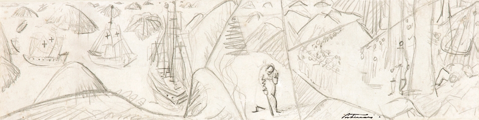 1937-1945: Vivíamos um período que insistentemente Gustavo Capanema – Ministro da Educação e Saúde Pública – queria dar visibilidade às propostas “modernas” que circulavam nos ambientes intelectuais da capital federal durante o Estado Novo, materializada através da construção de um “moderno” edifício para o MEC – Lúcio Costa, Oscar Niemeyer, et allis – e importante na vida de Portinari que compôs afrescos mostrando nosso “Ciclo Econômico” além dos cartões para os azulejos que revestem as paredes externas do edifício, que foram fabricados pela Osirarte, em São Paulo (1943, ca.). Em 1944, um acontecimento maior com a realização mural e azulejos sobre a vida de São Francisco para a Capela do Complexo da Pampulha em Belo Horizonte – leia-se Oscar Niemeyer – que completaria com a “Via Sacra” em 1945[6].
