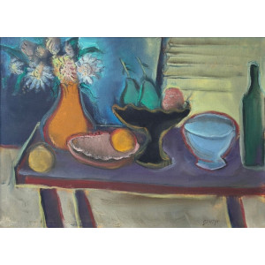 Mesa com vários objetos e flores - Carlos Bracher - 54 x 73 - cid - 1981