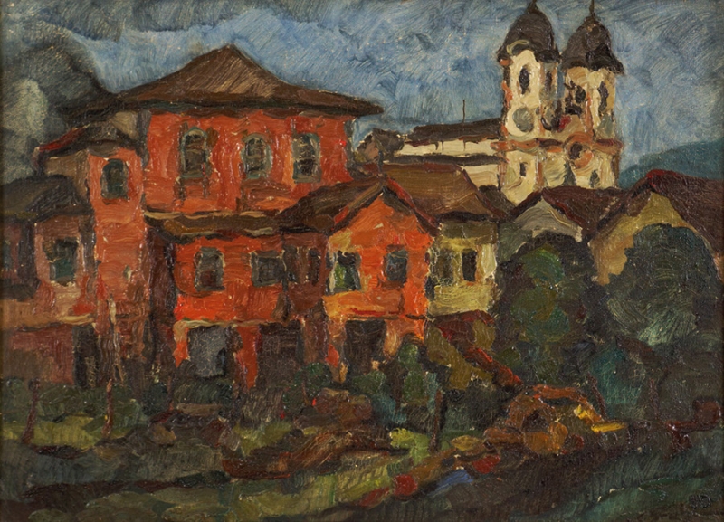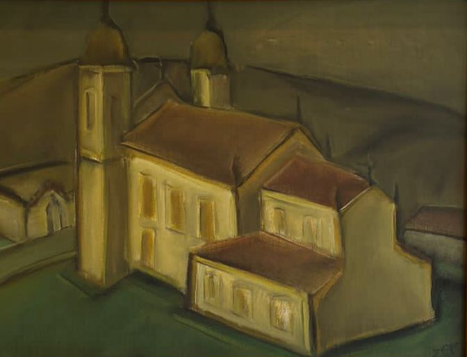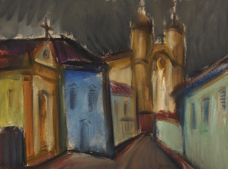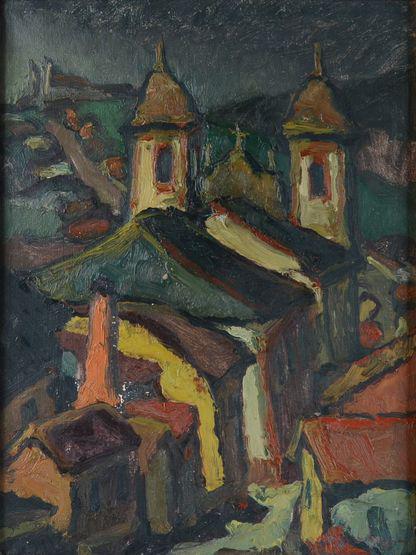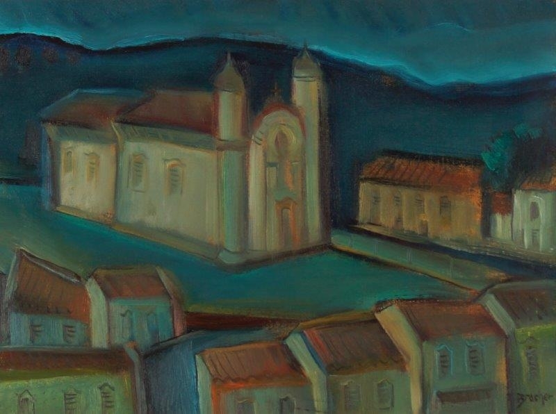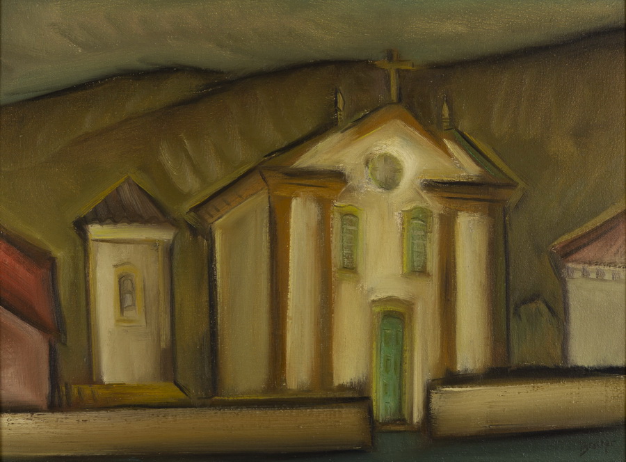 Carlos Bracher - Igreja do Senhor Bom Jesus do Matosinhos e Colégio Arquidiocesano - 54 x 73 cm - Óleo sobre tela - Assinatura verso e Data 1979