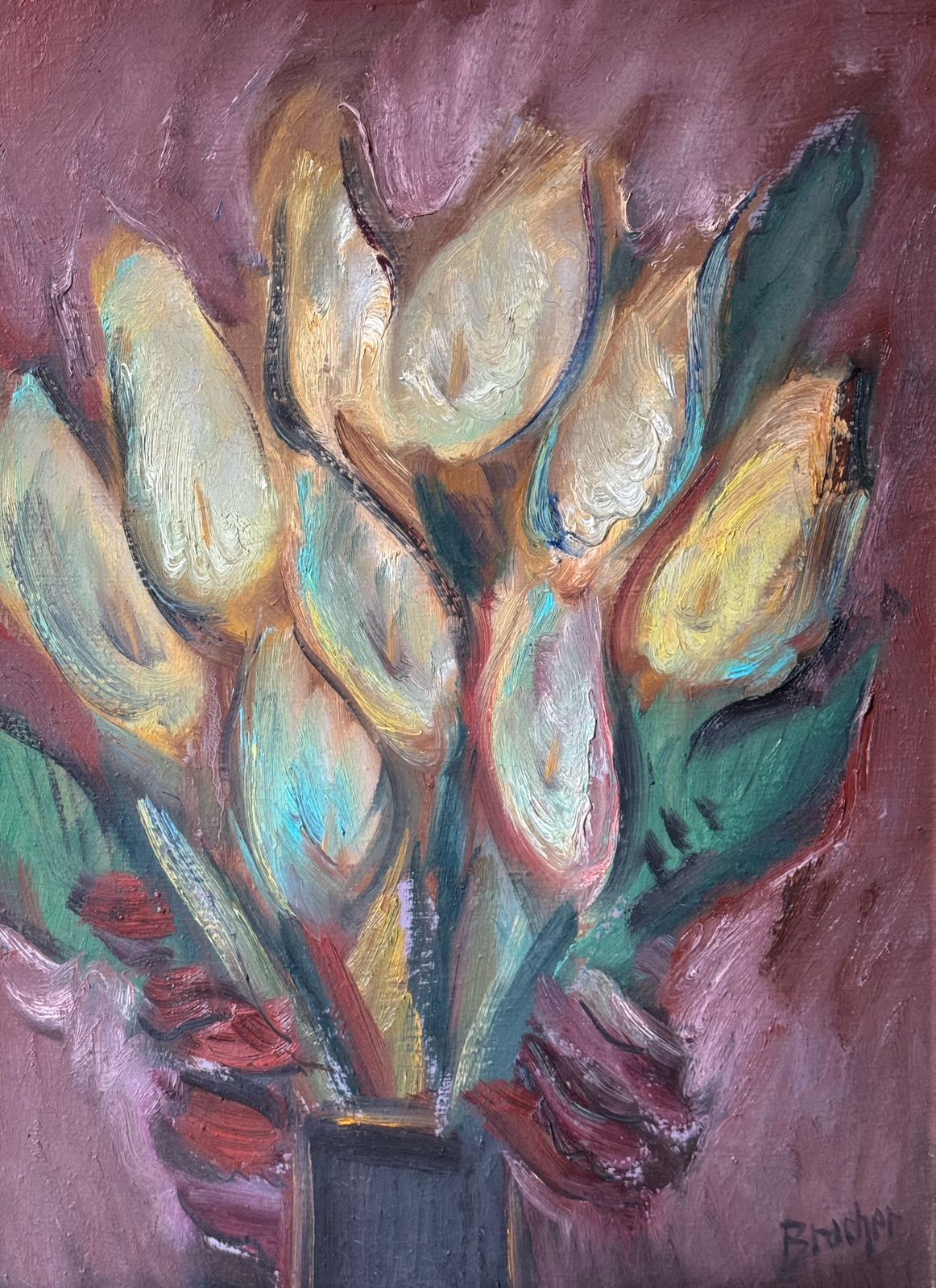Carlos Bernardo Bracher (Juiz de Fora, Minas Gerais, 1940). Pintor, desenhista, escultor, gravador. Frequenta a Sociedade de Belas Artes Antônio Parreiras, em Juiz de Fora, Minas Gerais, por volta de 1959. Entre 1965 e 1966, em Belo Horizonte, é aluno de Fayga Ostrower (1920-2001) na Universidade Federal de Minas Gerais (UFMG). Estuda técnicas de mural e de mosaico com Inimá de Paula (1918-1999), na Escola Municipal de Belas Artes. Em 1967, recebe o prêmio de viagem ao exterior do Salão Nacional de Belas Artes (SNBA) do Rio de Janeiro. Vai para a Europa, fixa-se principalmente em Paris e Lisboa, estuda pintura e expõe em galerias locais. Retorna ao Brasil em meados de 1970 e reside em Ouro Preto, Minas Gerais. Em 1989, é realizada a exposição retrospectiva de seus 30 anos de trabalho, intitulada Pintura Sempre, em São Paulo, Curitiba, Rio de Janeiro, Brasília e Belo Horizonte. No ano seguinte, pinta uma série de quadros em homenagem ao centenário da morte do pintor holandês Vincent van Gogh (1853 - 1890), que é exposta em várias galerias e museus no Brasil e no exterior. São editados vários livros sobre sua obra, entre eles, Bracher, do crítico Olívio Tavares de Araújo, pela editora Métron, em 1989, e Bracher: Do Ouro ao Aço, pela editora Salamandra, em 1992.