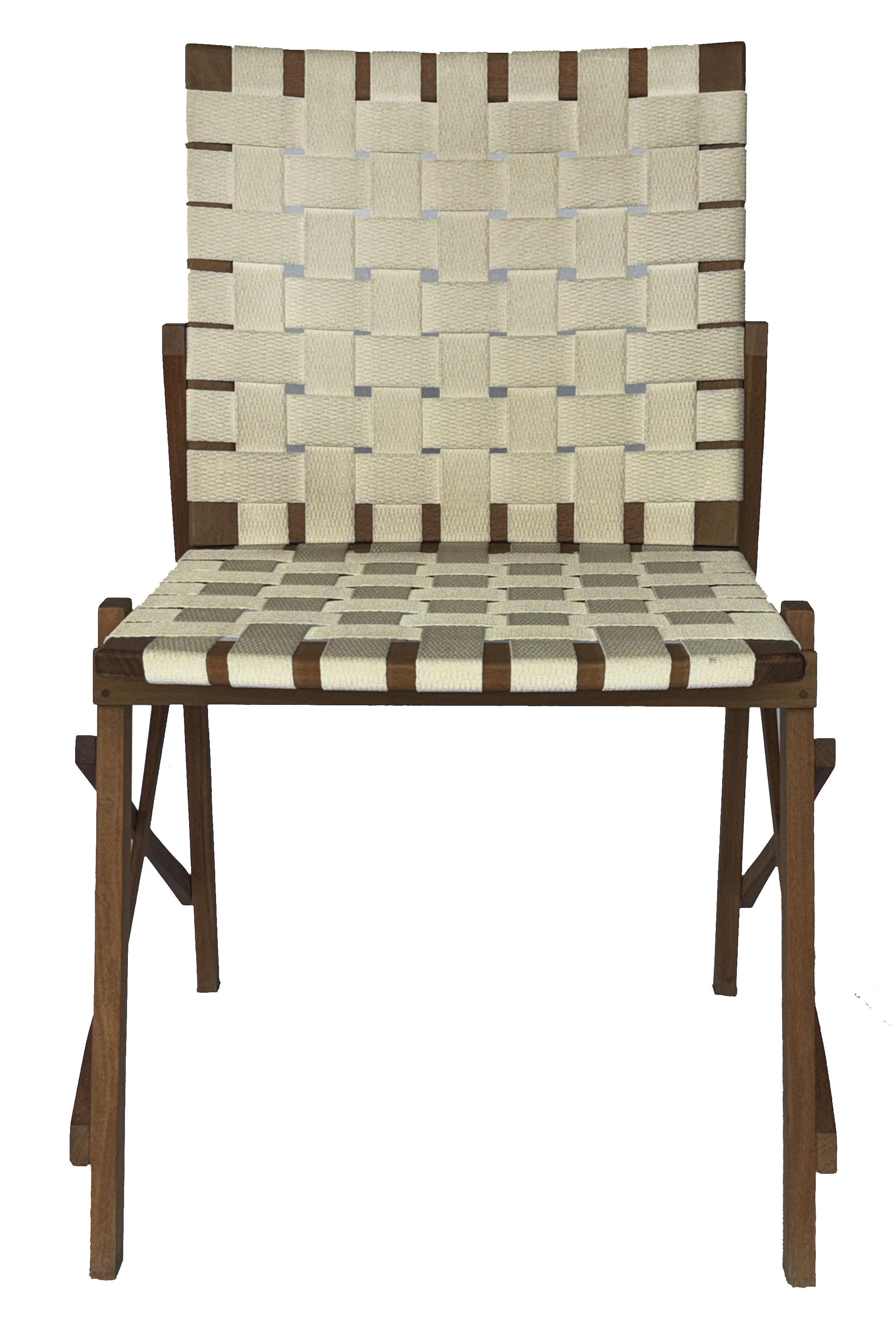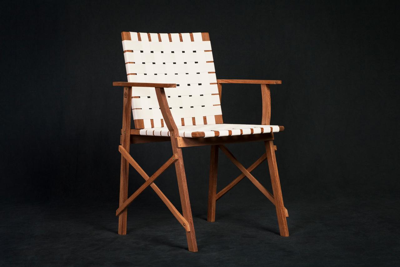 Criei a linha Maresias, incluindo a cadeira, durante uma viagem de surfe à Califórnia e fazem parte de uma coleção caracterizada pela leveza, estrutura em madeira Cumaru certificada (FSC) e trançados de couro ou percintas náuticas, sendo ideal para áreas externas e internas.