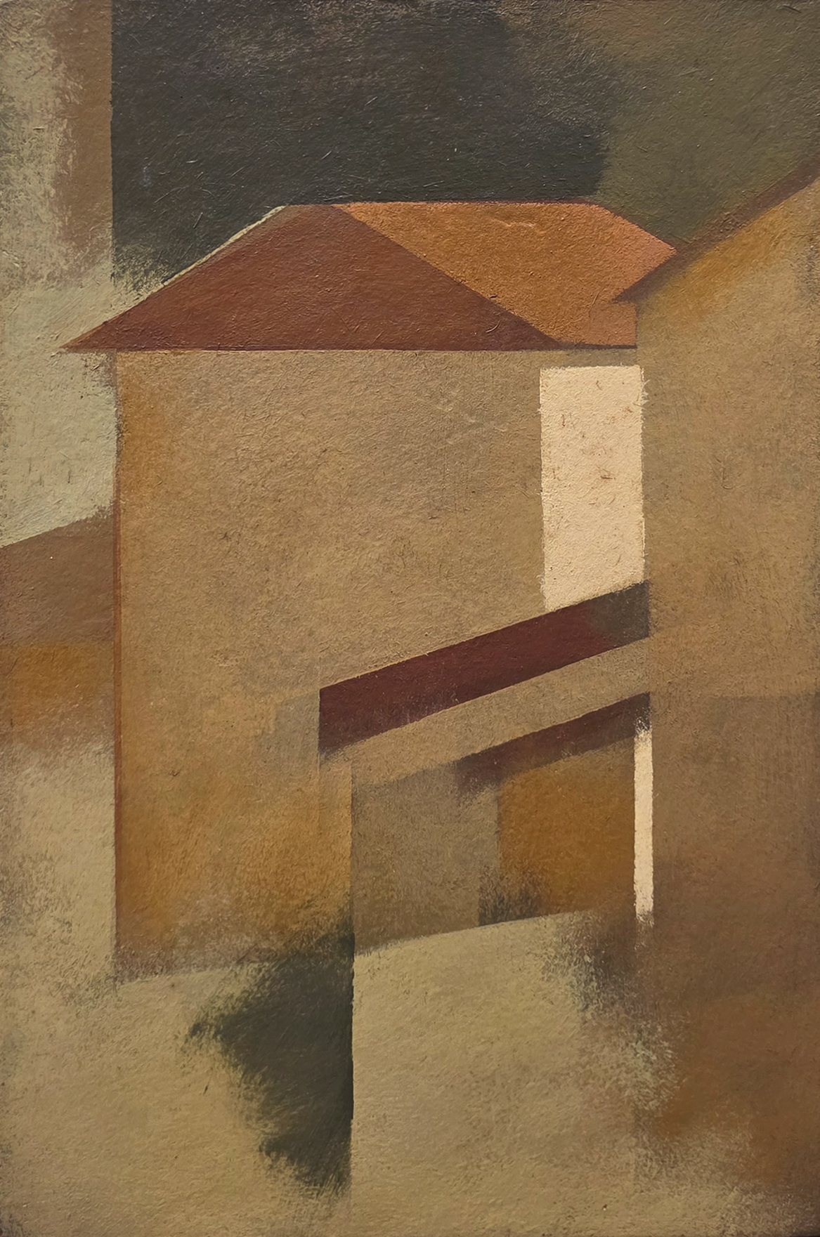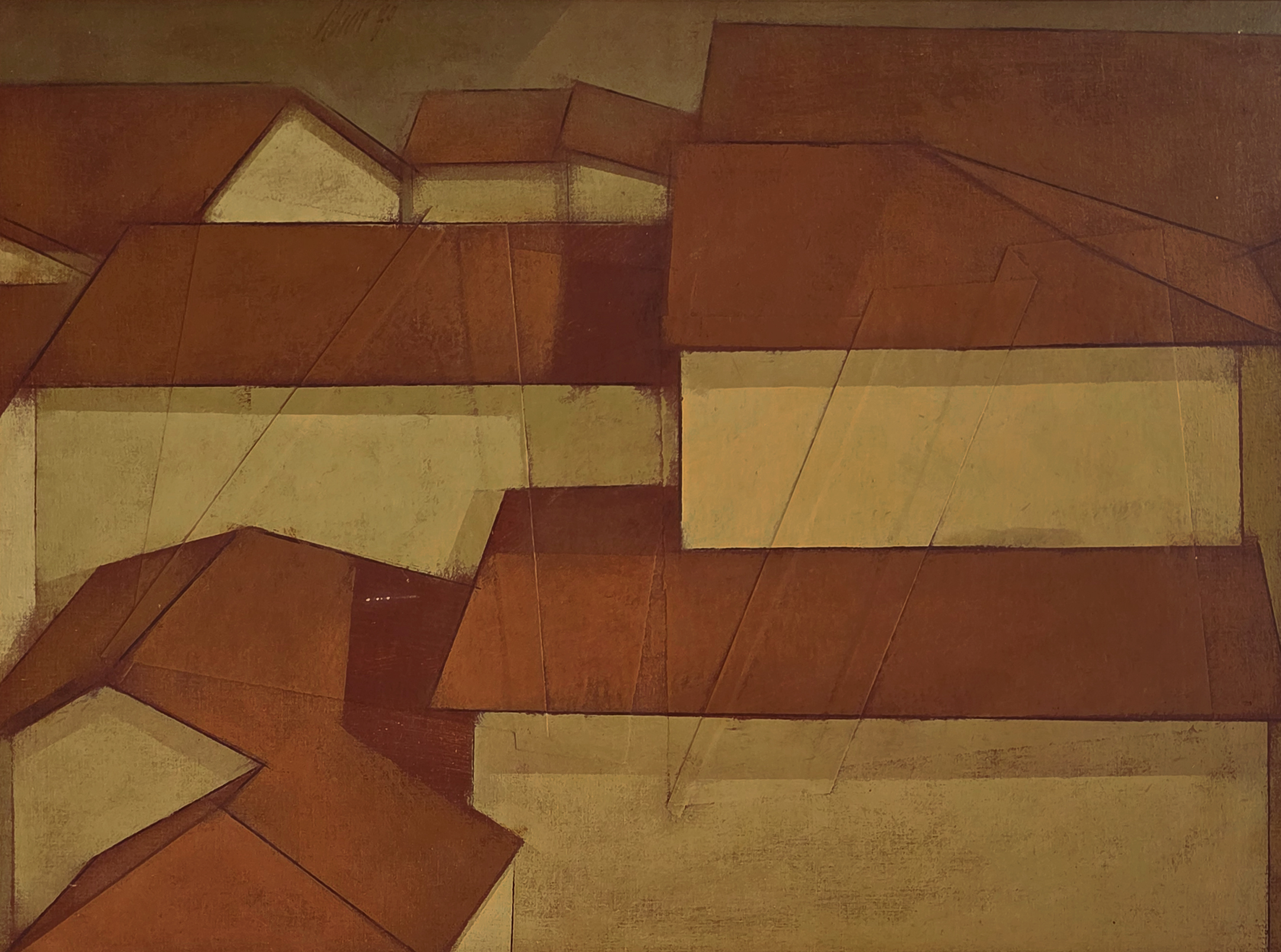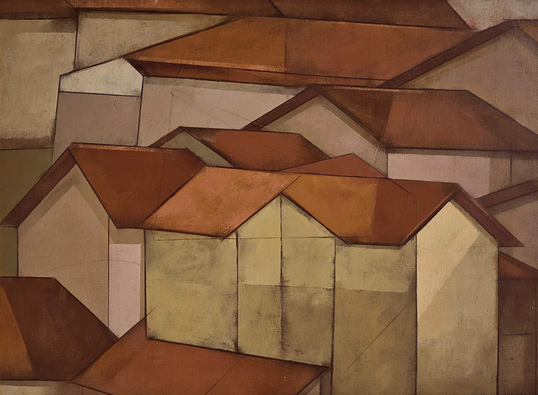 Carlos Scliar - Paisagem VII. Vinil e colagens encerados sobre tela colada em madeira, 55x75 cm, 1989, A.C.I.E. e V. Com moldura