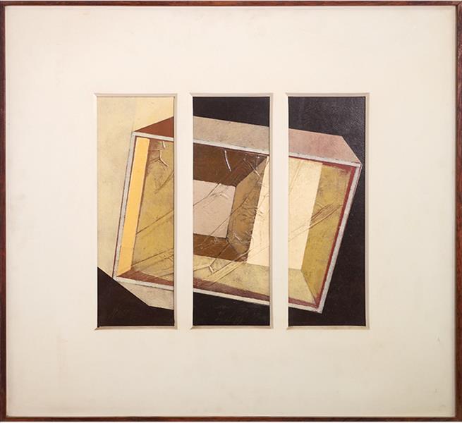 CARLOS SCLIAR, Composição - Tríptico, Vinil Encerado sobre Madeira, ACSD, 36 x 12cm (cada) e 66 x 72cm. (total c/ moldira). Datado 1972