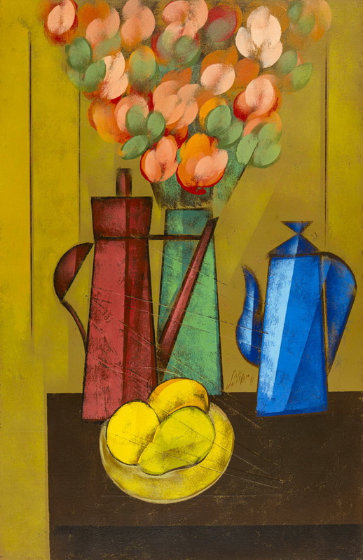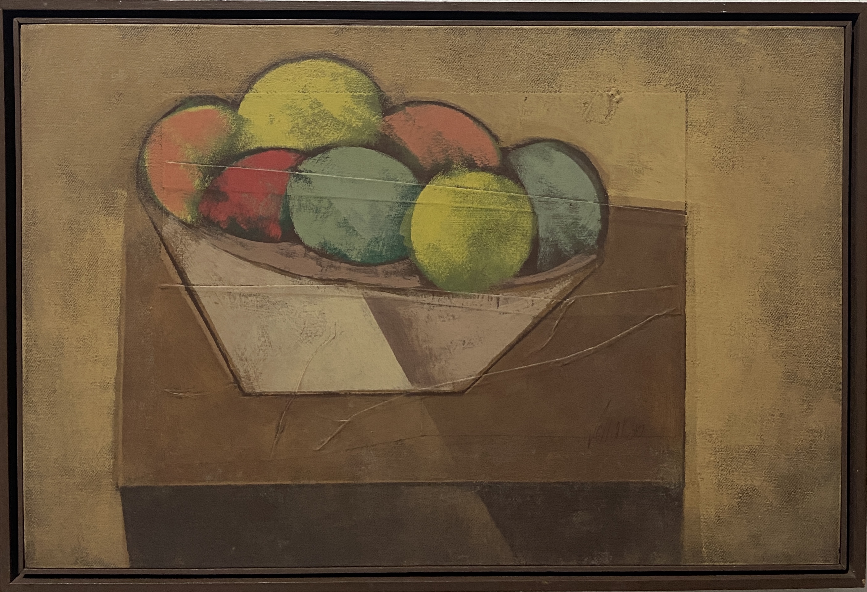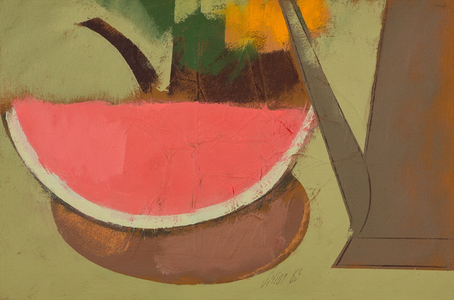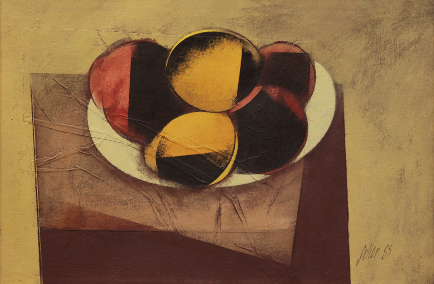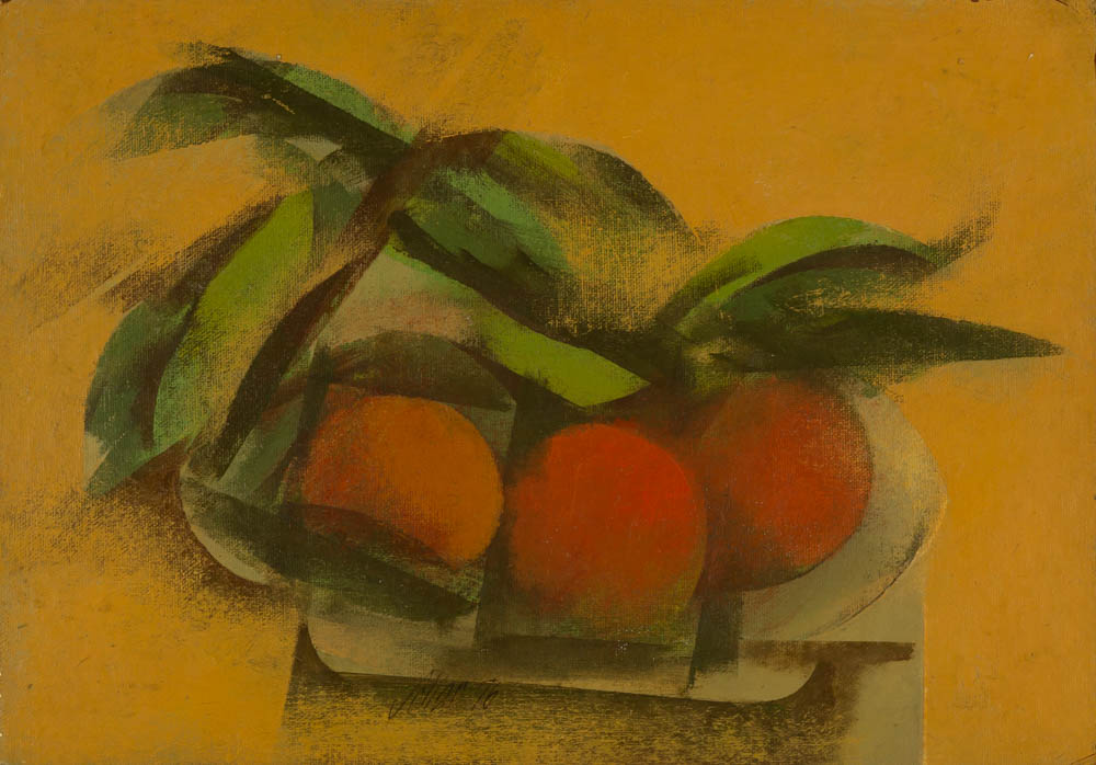 Carlos Scliar - Tomates japoneses no prato - 37 x 56 cm - Vinil e colagem sobre tela colada em eucatex - Assinatura canto inferior direito e Data 1982