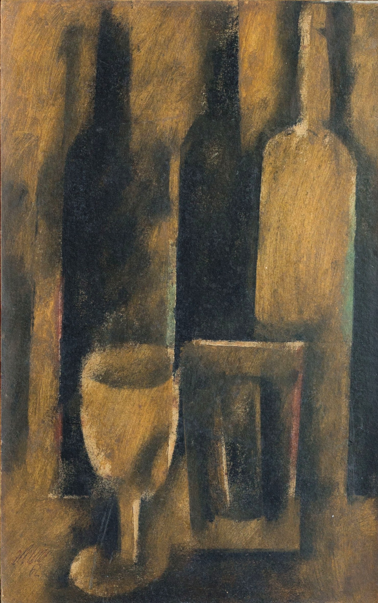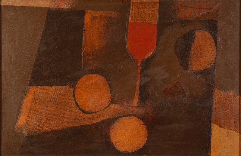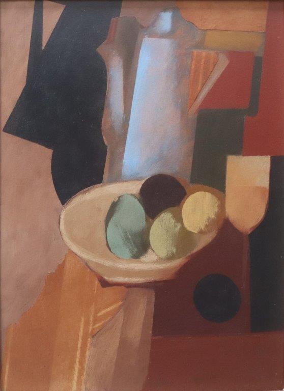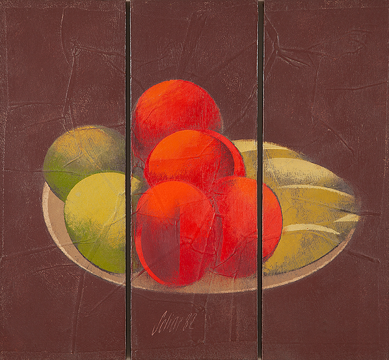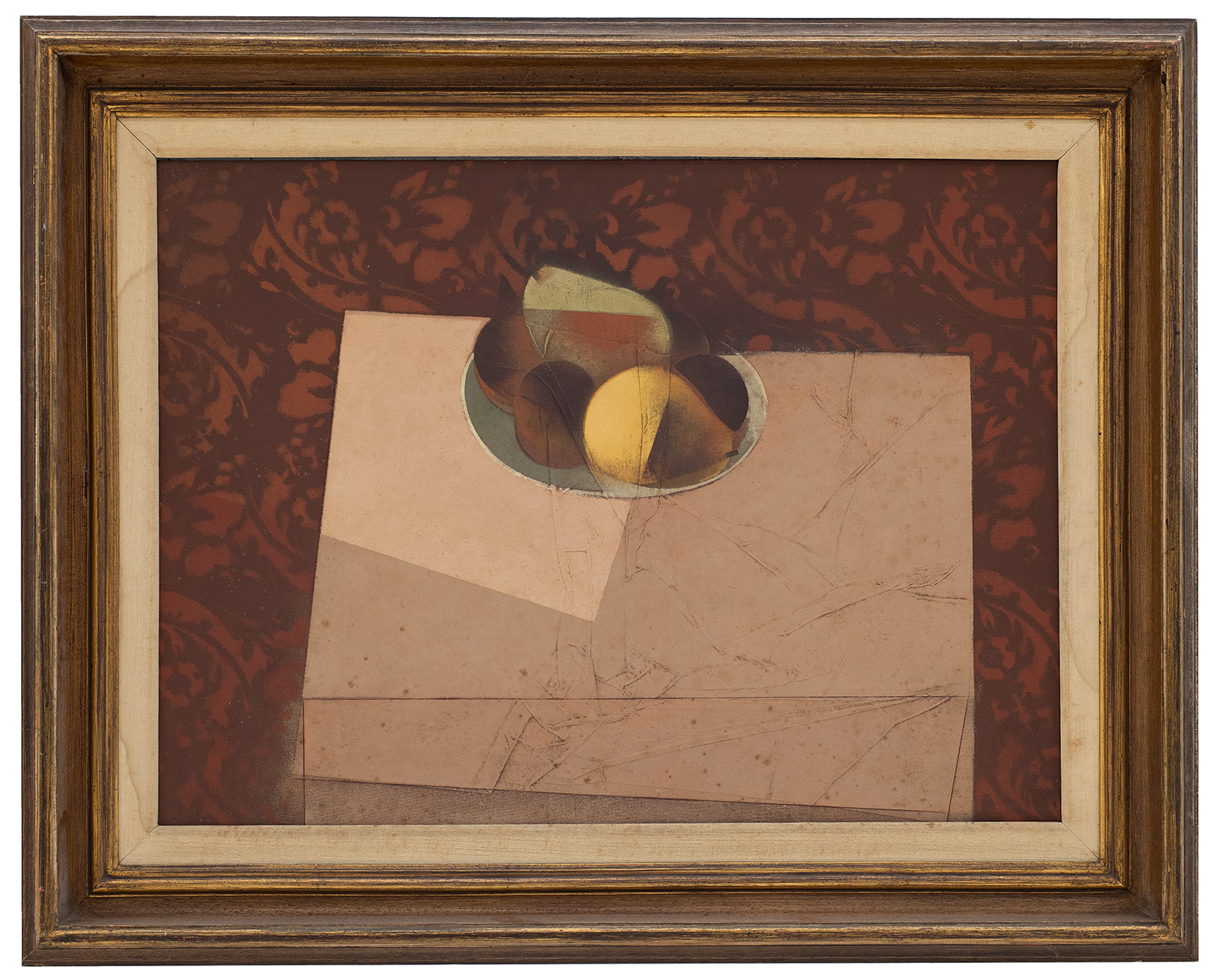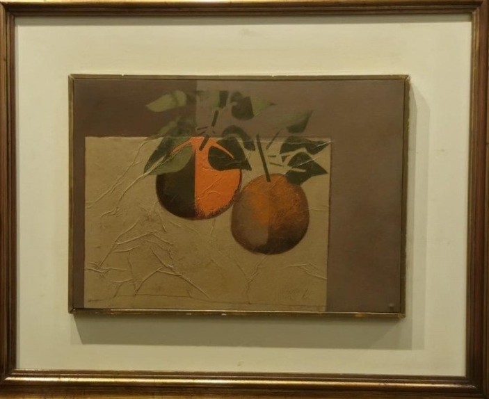 Carlos Scliar - Bule e frutas, 1995 - Vinil e colagem encerrados sobre tela, assinado e datado inferior direito; assinado, datado, titulado e situado Cabo Frio no verso.- 56 x 37 cm.