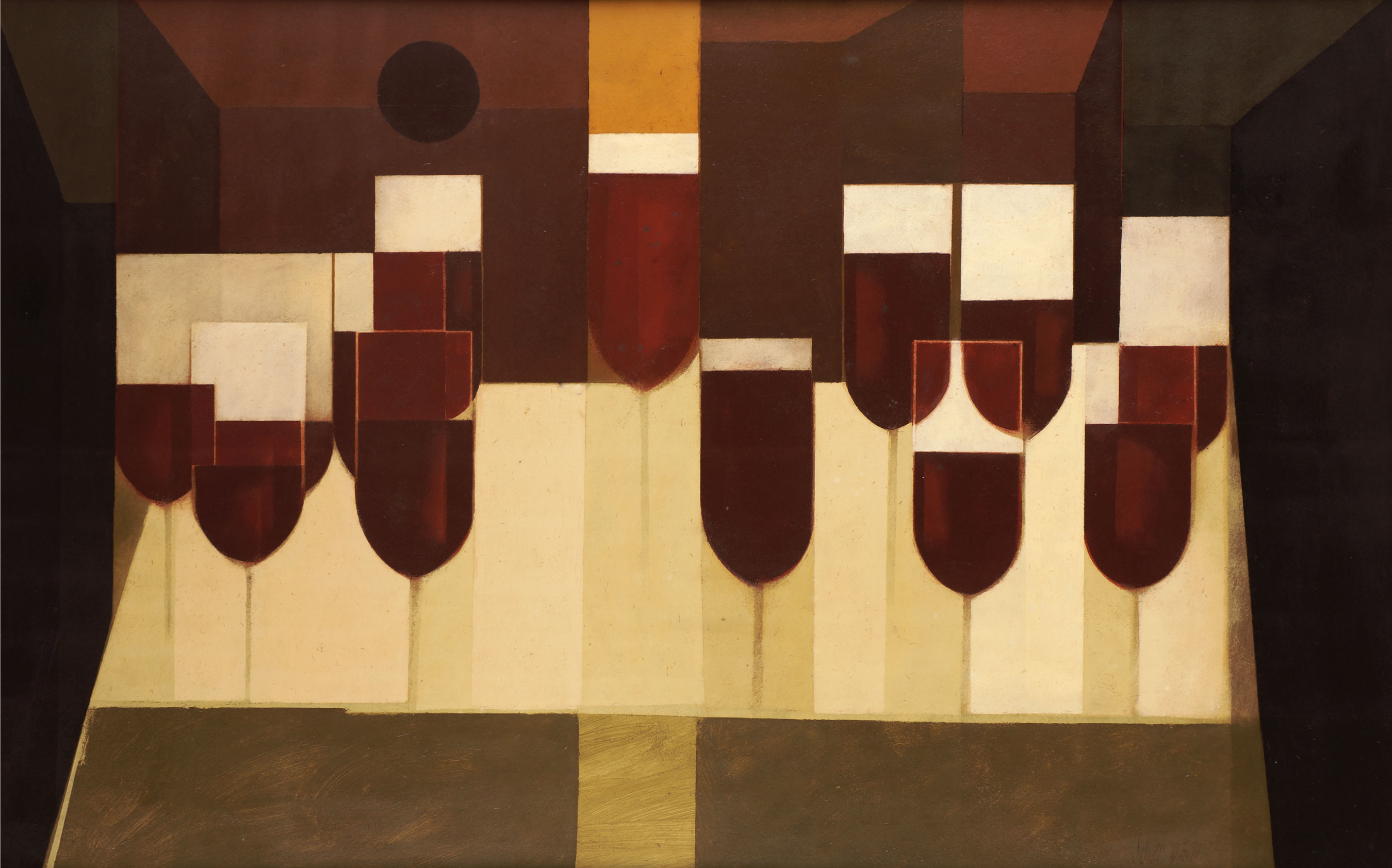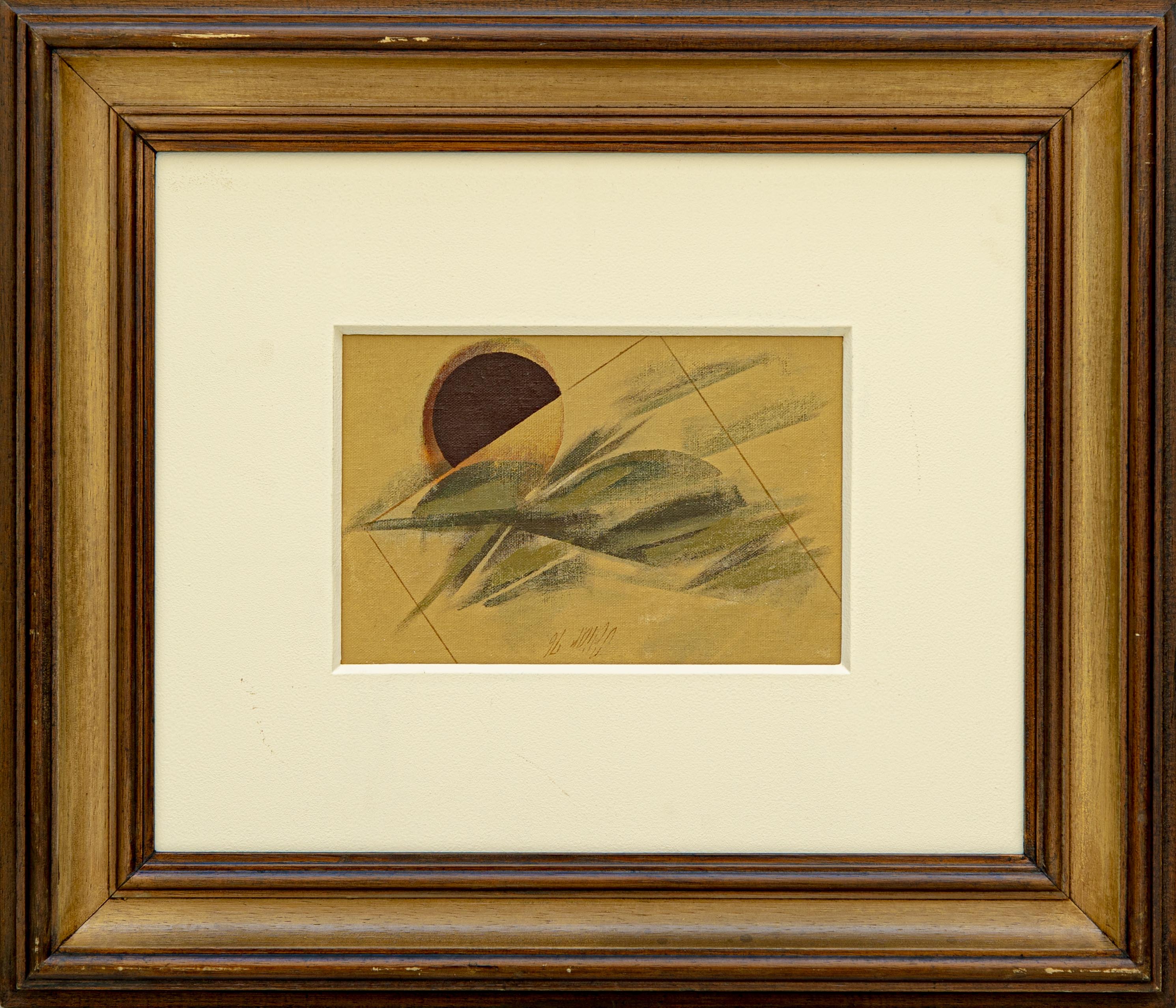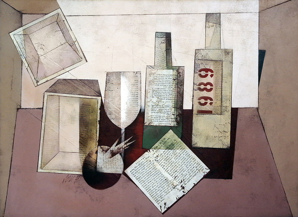 Carlos Scliar - Bule e frutas, 1995 - Vinil e colagem encerrados sobre tela, assinado e datado inferior direito; assinado, datado, titulado e situado Cabo Frio no verso.- 56 x 37 cm.