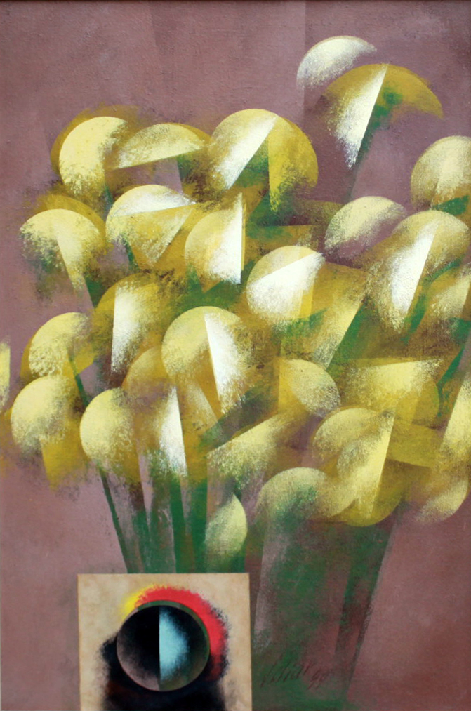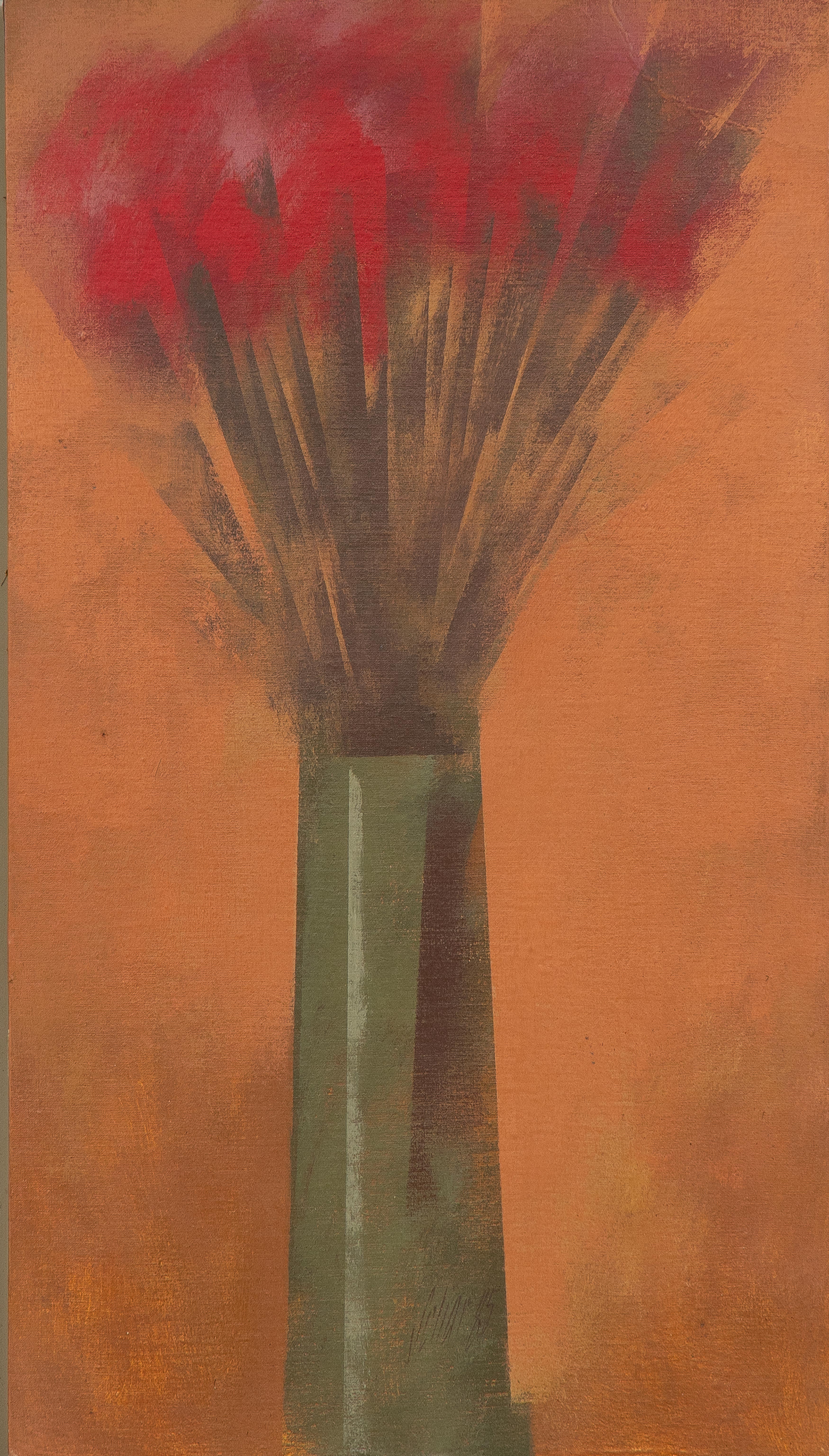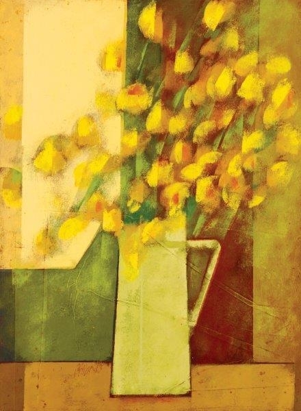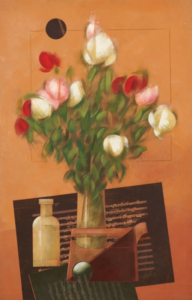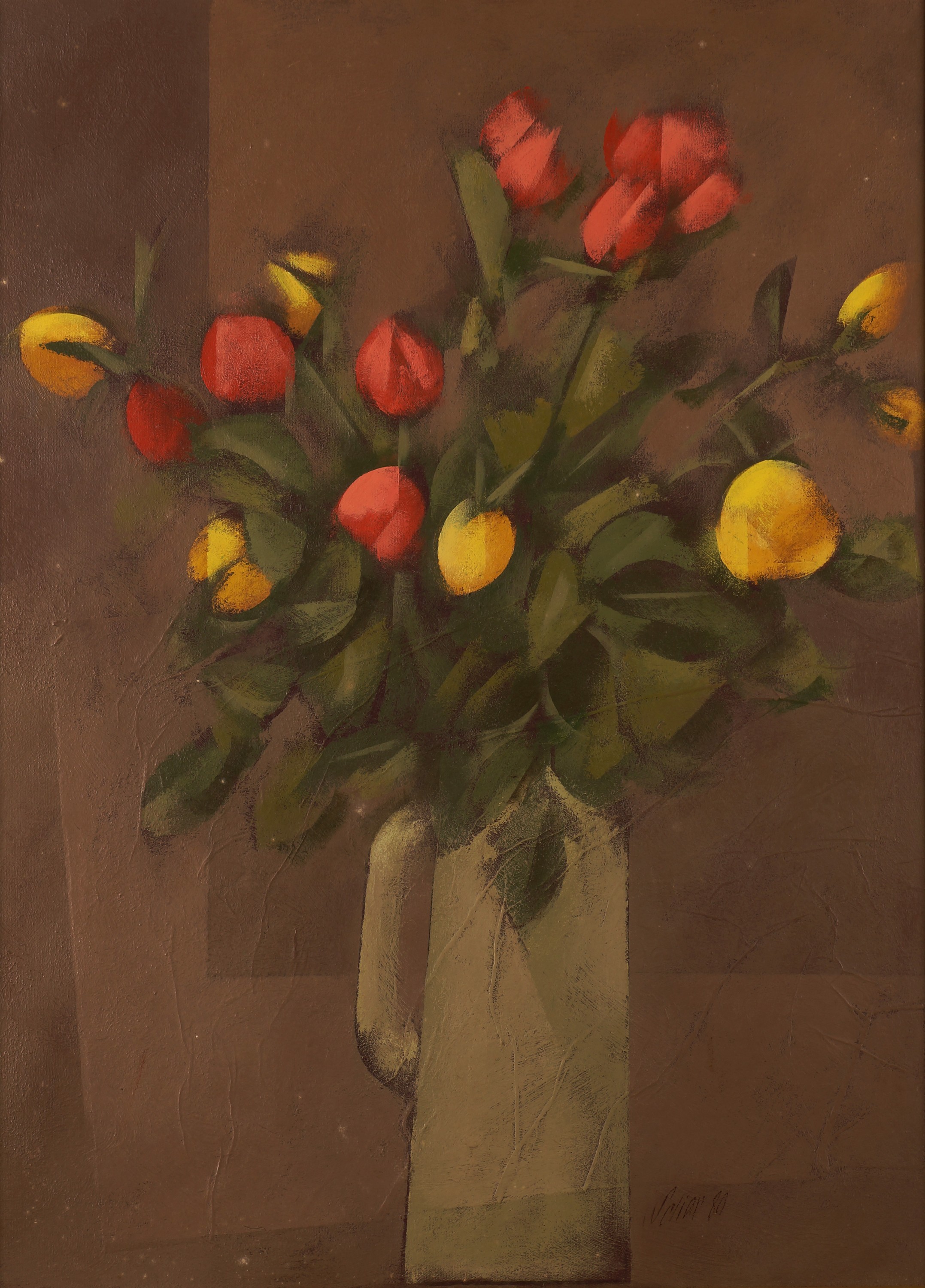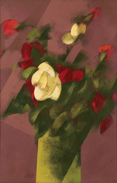 Carlos Scliar - Rosas, 1990 - Vinil e colagem encerrados sobre tela, assinado e datado inferior esquerdo; assinado, datado, titulado e situado Cabo Frio no verso.- 56 x 37 cm.