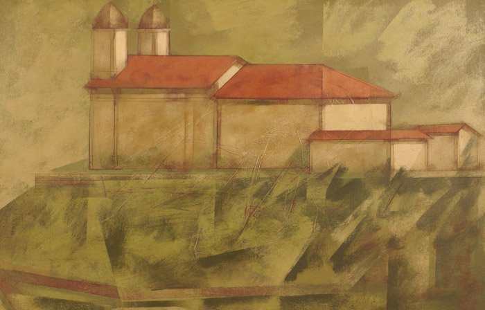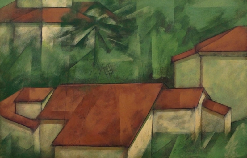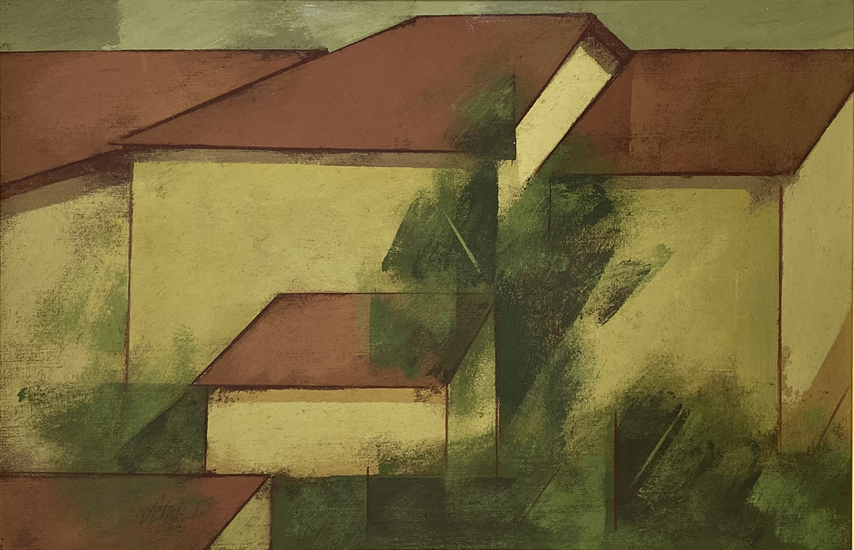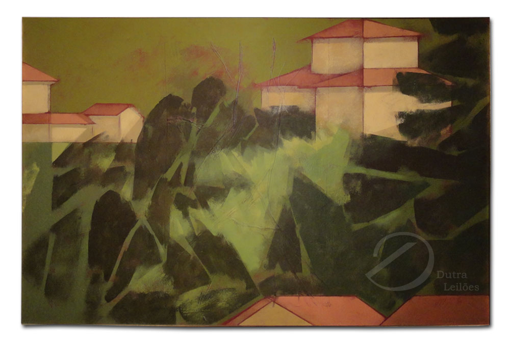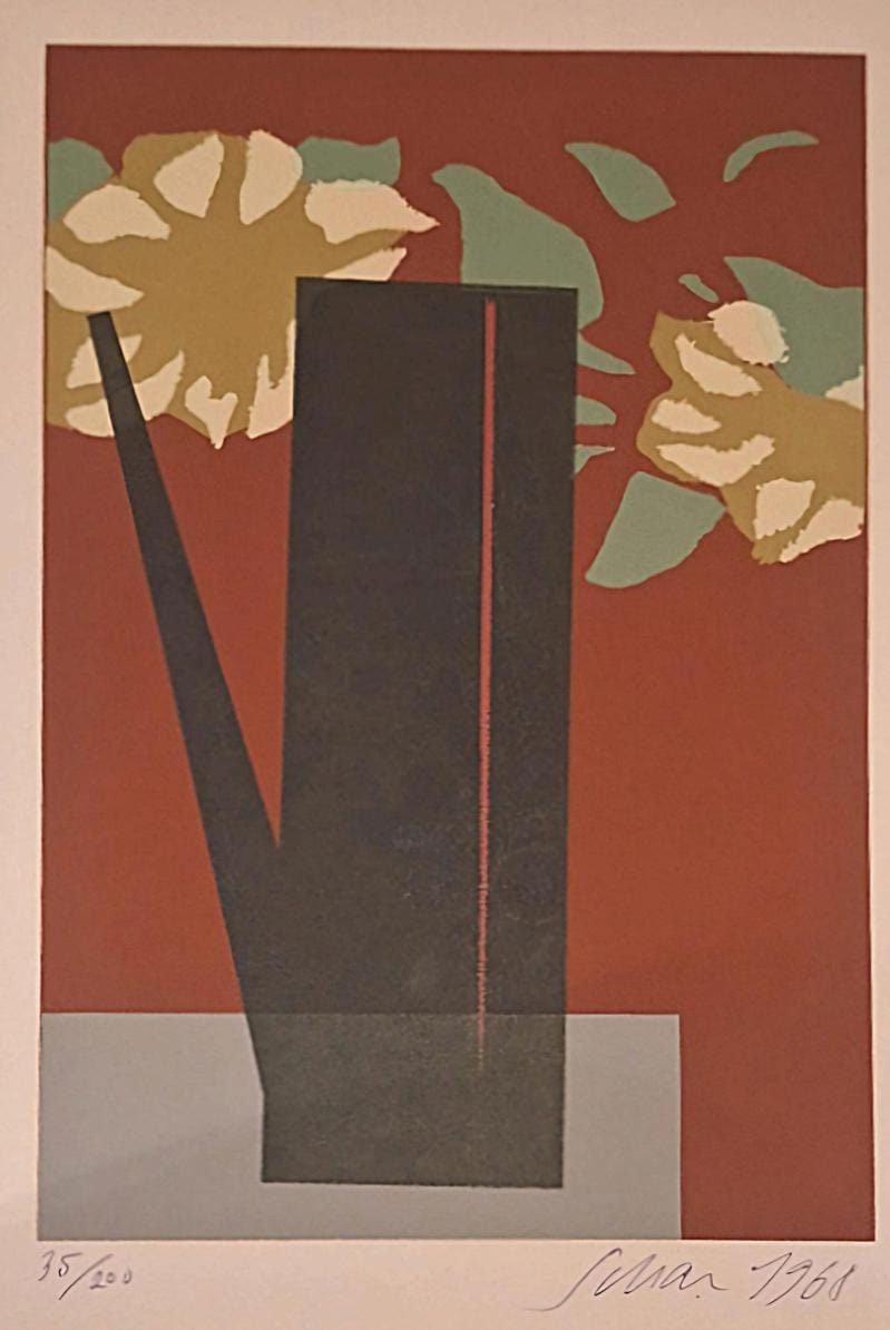 Carlos Scliar - Rosas, 1990 - Vinil e colagem encerrados sobre tela, assinado e datado inferior esquerdo; assinado, datado, titulado e situado Cabo Frio no verso.- 56 x 37 cm.