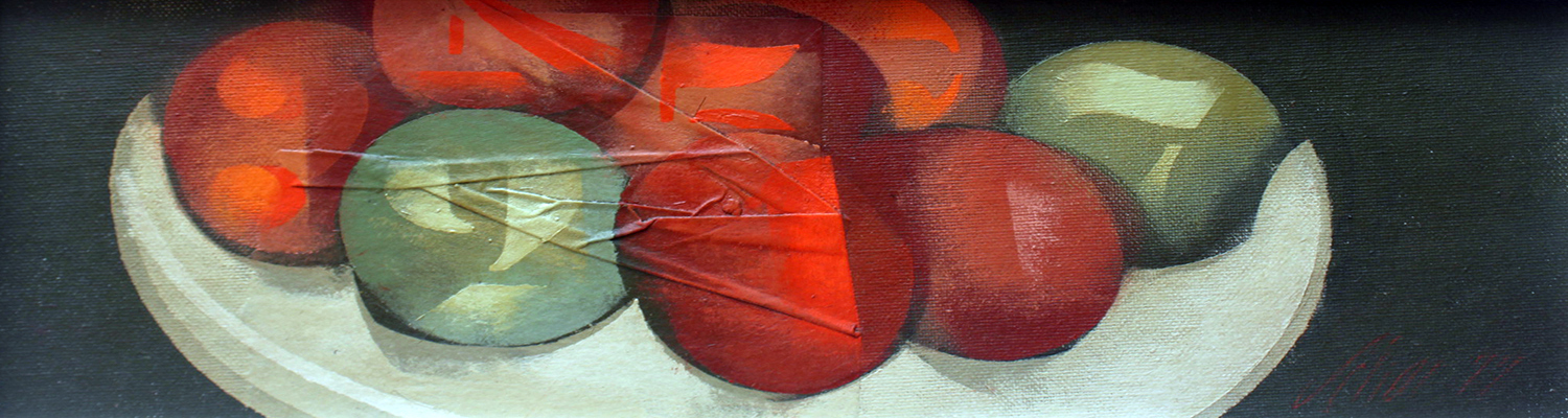 Carlos Scliar - Tomates japoneses no prato - 37 x 56 cm - Vinil e colagem sobre tela colada em eucatex - Assinatura canto inferior direito e Data 1982