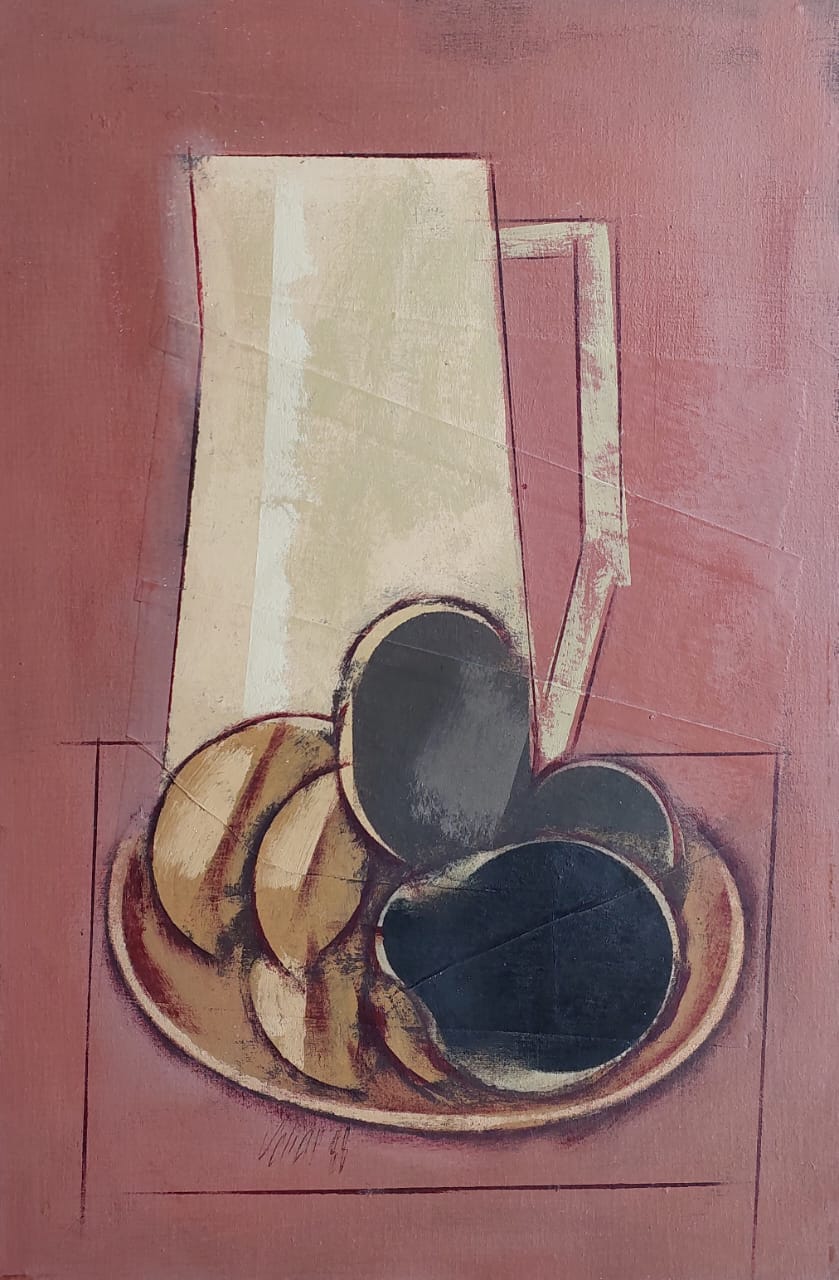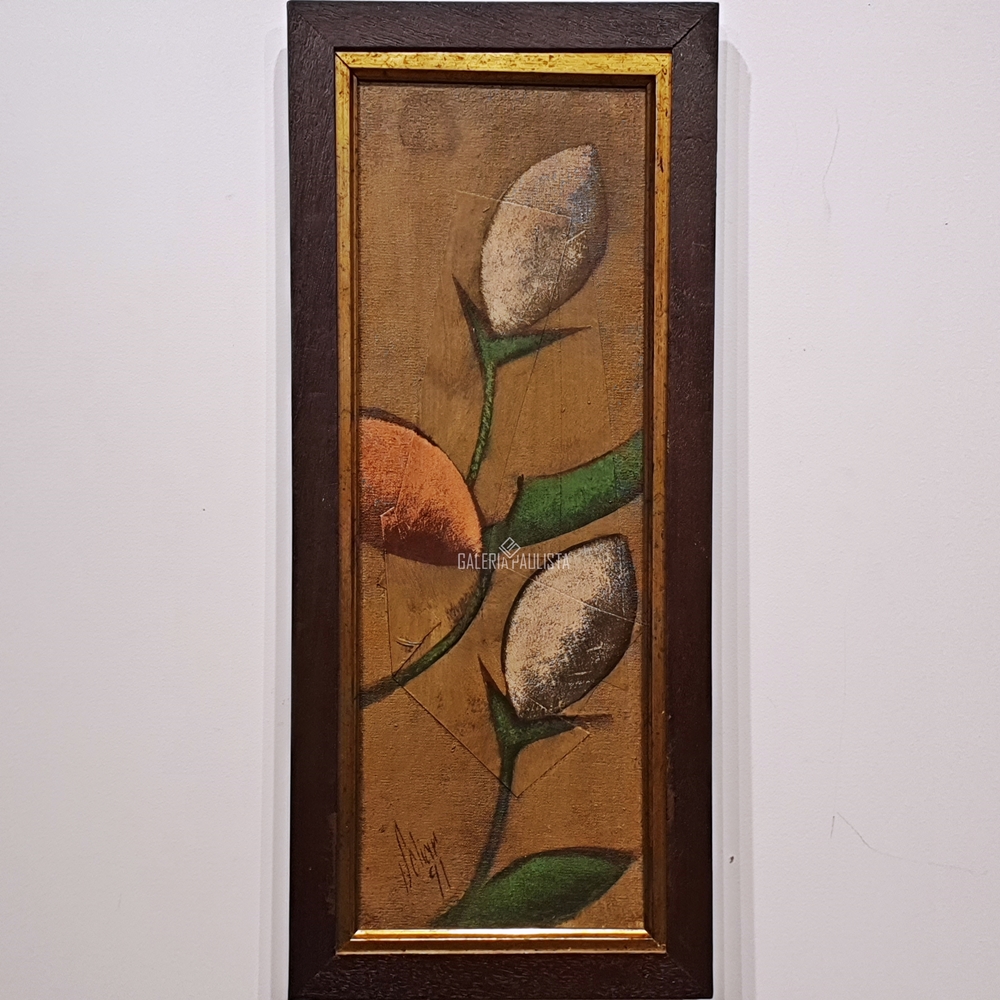 Carlos Scliar - Tomates japoneses no prato - 37 x 56 cm - Vinil e colagem sobre tela colada em eucatex - Assinatura canto inferior direito e Data 1982