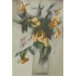 Carlos Scliar - Composição com flores, bules e frutas - Vinil encerado e colado sobre tela - 100 x 65 - 14-2-1987 - Ass. Canto inferior direito e verso