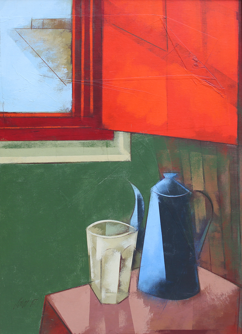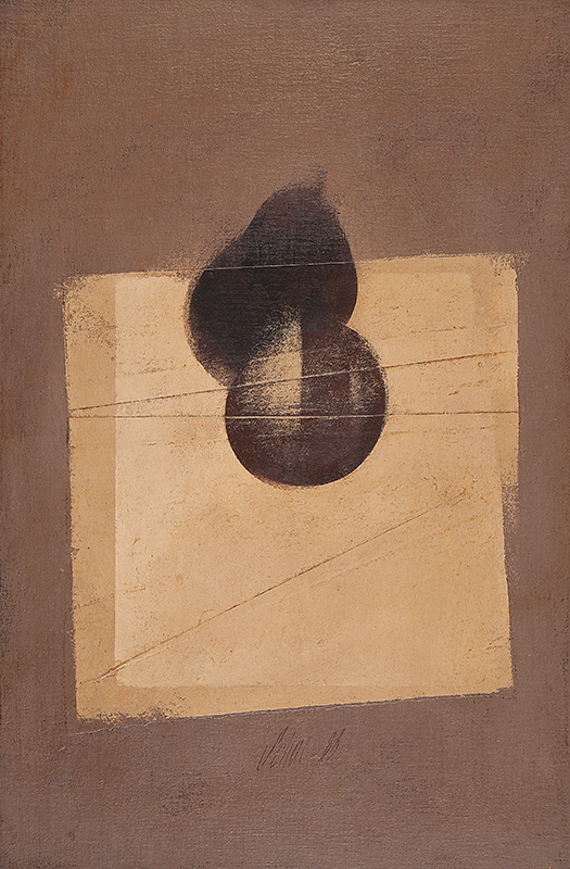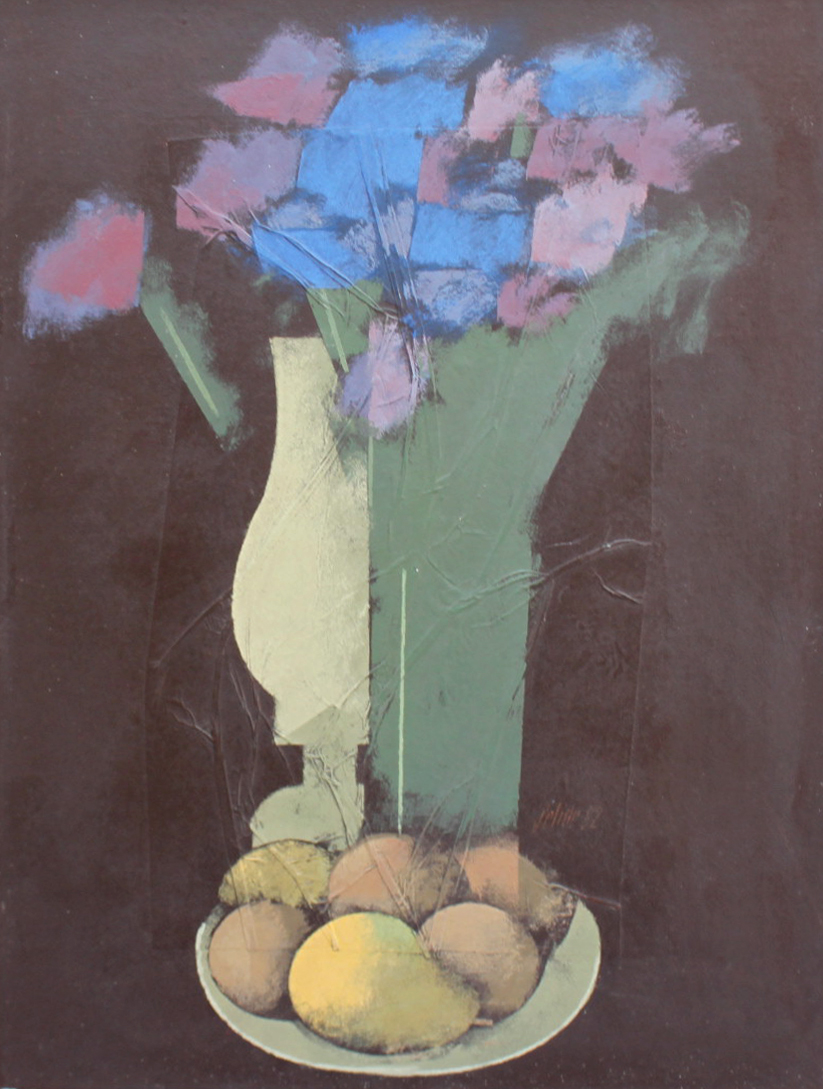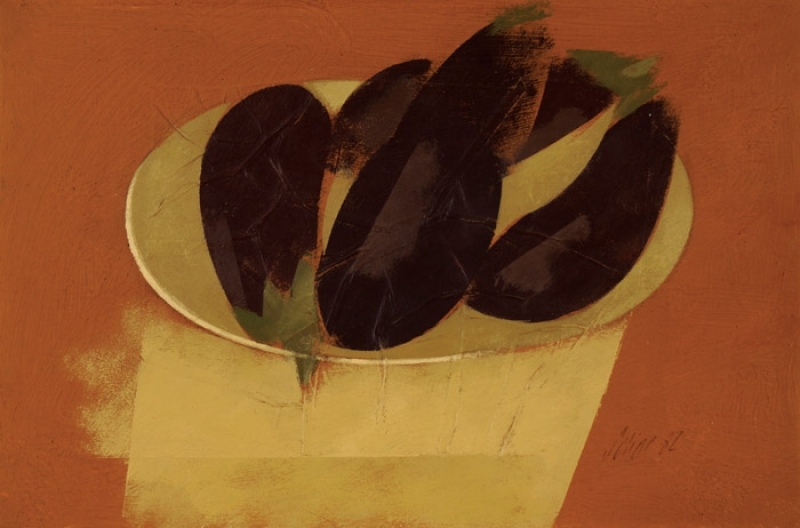 Carlos Scliar - Tomates japoneses no prato - 37 x 56 cm - Vinil e colagem sobre tela colada em eucatex - Assinatura canto inferior direito e Data 1982
