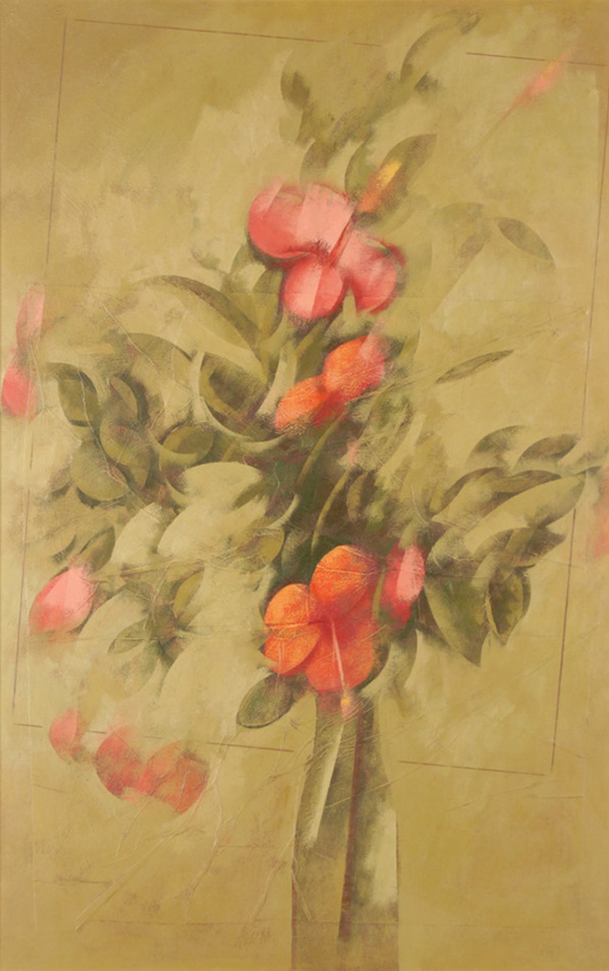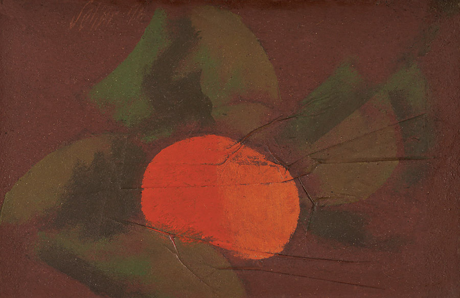 Carlos Scliar - Tomates japoneses no prato - 37 x 56 cm - Vinil e colagem sobre tela colada em eucatex - Assinatura canto inferior direito e Data 1982