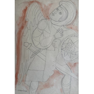 Chanina - Anjo Arqueiro - Grafite e Aguada sobre Papel - 32 x 20 cm - Ass. CIE - Emoldurada - Doação do colecionador Sérgio Pereira, obra 0185 de seu acervo