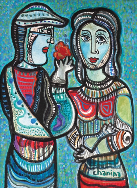 Chanina - A festa da colombina apaixonada - Homenagem a Chagall - 46 x 38 cm - Óleo sobre tela - Assinatura canto inferior esquerdo e Data década de 60 - Obra reproduzida no livro escrito por Jaboc Klintowitz
