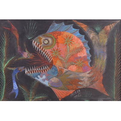 Chico da Silva - Peixe Fantástico - Têmpera sobre tela - Medidas 50 x 70 cm - Assinado e datado 1971
