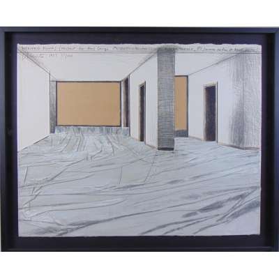 Christo - Wrapped Monument to Vittorio Emanuele, (Project for Piazza del Duomo, Milano), 1975. - A - Fotografia em preto e branco impressa em papelão grosso, montado em caixa de acrílico. - Numerada 4/75 inferior direito. - 71 x 56 cm. - B - Litografia, fotografia e colagem, montado em caixa de acrílico. - Assinada, titulada e numerada 4/75 parte inferior. - 71 x 56 cm.- C - Litografia colorida com colagem de tecido, e barbante sobre papel guarro montado em papelão e caixa de acrílico acrílico. - Assinado e numerado 4/75 inferior direito. - 71 x 56 cm.